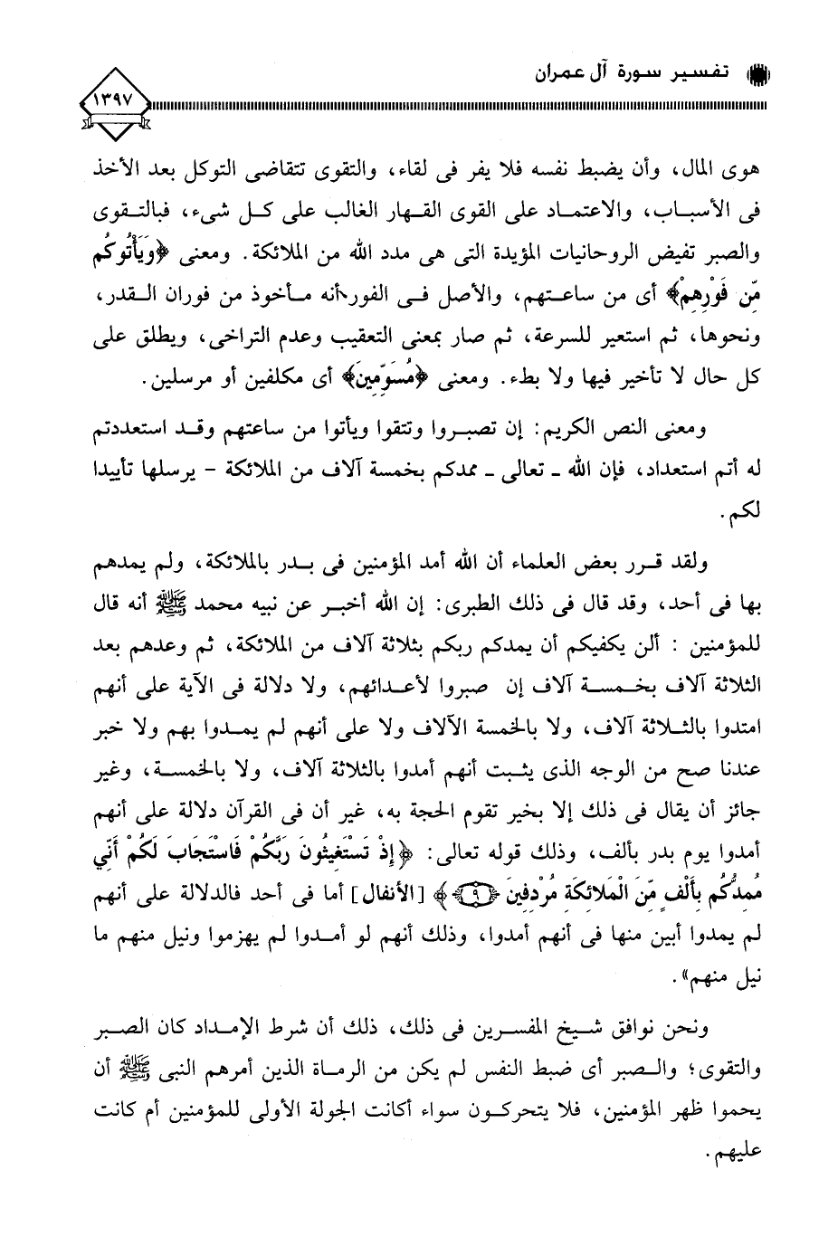 هوى المال، وأن يضبط نفسه فلا يفر في لقاء، والتقوى تتقاضى التوكل بعد الأخذ في الأسباب، والاعتماد على القوي القهَّار الغالب على كل شيء، فبالتقوى والصبر تفيض الروحانيات المؤيدة التي هي مدد الله من الملائكة. ومعنى (وَيَأْتُوكُمْ مِنْ فَوْرِهِمْ) أي من ساعتهم، والأصل في الفوركأنه مأخوذ من فوران القدر، ونحوها، ثم استعير للسرعة، ثم صار بمعنى التعقيب وعدم التراخي، ويطلق على كل حال لَا تأخير فيها ولا بطء. ومعنى (مسَوِّمِينَ) أي مكلفين أو مرسلين.