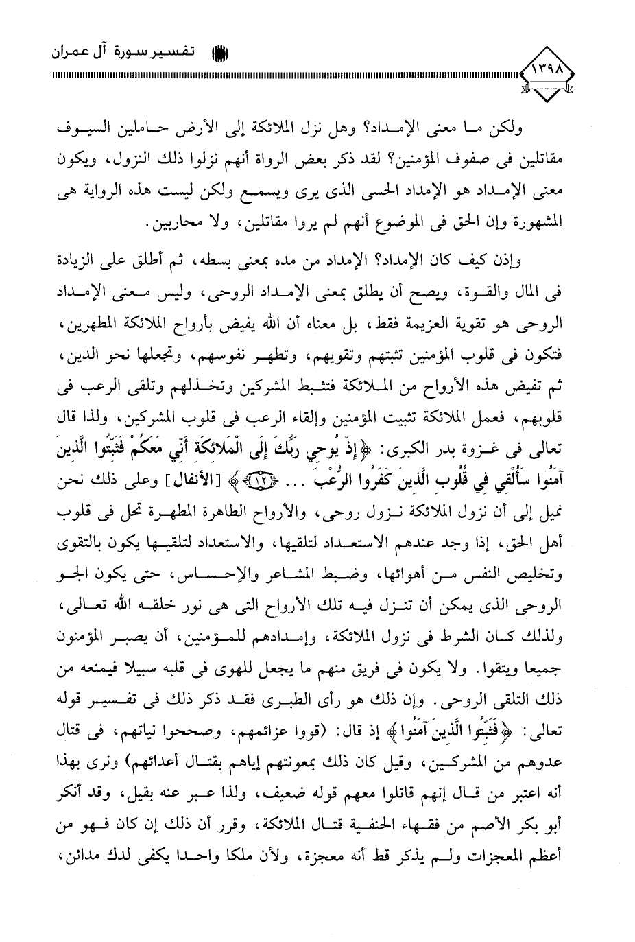 وإذن كيف كان الإمداد؛ الإمداد من مده بمعنى بسطه، ثم أطلق على الزيادة في المال والقوة، ويصح أن يطلق بمعنى الإمداد الروحي، وليس معنى الإمداد الروحي هو تقوية العزيمة فقط، بل معناه أن الله يفيض بأرواح الملائكة المطهرين، فتكون في قلوب المؤمنين تثبتهم وتقويهم، وتطهر نفوسهم، وتجعلها نحو الدين، ثم تفيض هذه الأرواح من الملائكة فتثبط المشركين وتخذلهم وتلقي الرعب في قلوبهم، فعمل الملائكة تثبيت المؤمنين وإلقاء الرعب في قلوب المشركين، ولذا قال تعالى في غزوة بدر الكبرى: (إِذْ يُوحِي رَبُّكَ إِلَى الْمَلائِكَةِ أَنِّي مَعَكُمْ فَثَبِّتُوا الَّذِينَ آمَنُوا سَأُلْقِي فِي قُلُوبِ الَّذِينَ كَفَرُوا الرُّعْبَ. . .)، وعلى ذلك نحن نميل إلى أن نزول الملائكة نزول روحي، والأرواح الطاهرة المطهرة تحل في قلوب أهل الحق، إذا وجد عندهم الاستعداد لتلقيها، والاستعداد لتلقيها يكون بالتقوى وتخليص النفس من أهوائها، وضبط المشاعر والإحساس، حتى يكون الجو الروحي الذي يمكن أن تنزل فيه تلك الأرواح التي هي نور خلقه الله تعالى، ولذلك كان الشرط في نزول الملائكة، وإمدادهم للمؤمنين، أن يصبر المؤمنون جميعا ويتقوا. ولا يكون في فريق منهم ما يجعل للهوى في قلبه سبيلا فيمنعه من ذلك التلقي الروحي. وإن ذلك هو رأي الطبري فقد ذكر ذلك في تفسير قوله تعالى: (فَثَبِّتُوا الَّذِينَ آمَنوا) إذ قال: (قووا عزائمهم، وصححوا نياتهم، في قتال عدوهم من المشركين، وقيل كان ذلك بمعونتهم إياهم بقتال أعدائهم) ونرى بهذا أنه اعتبر من قال إنهم قاتلوا معهم قوله ضعيف، ولذا عبر عنه بقيل، وقد أنكر أبو بكر الأصم من فقهاء الحنفية قتال الملائكة، وقرر أن ذلك إن كان فهو من أعظم المعجزات ولم يذكر قط أنه معجزة، ولأن ملكا واحدا يكفي لدك مدائن،