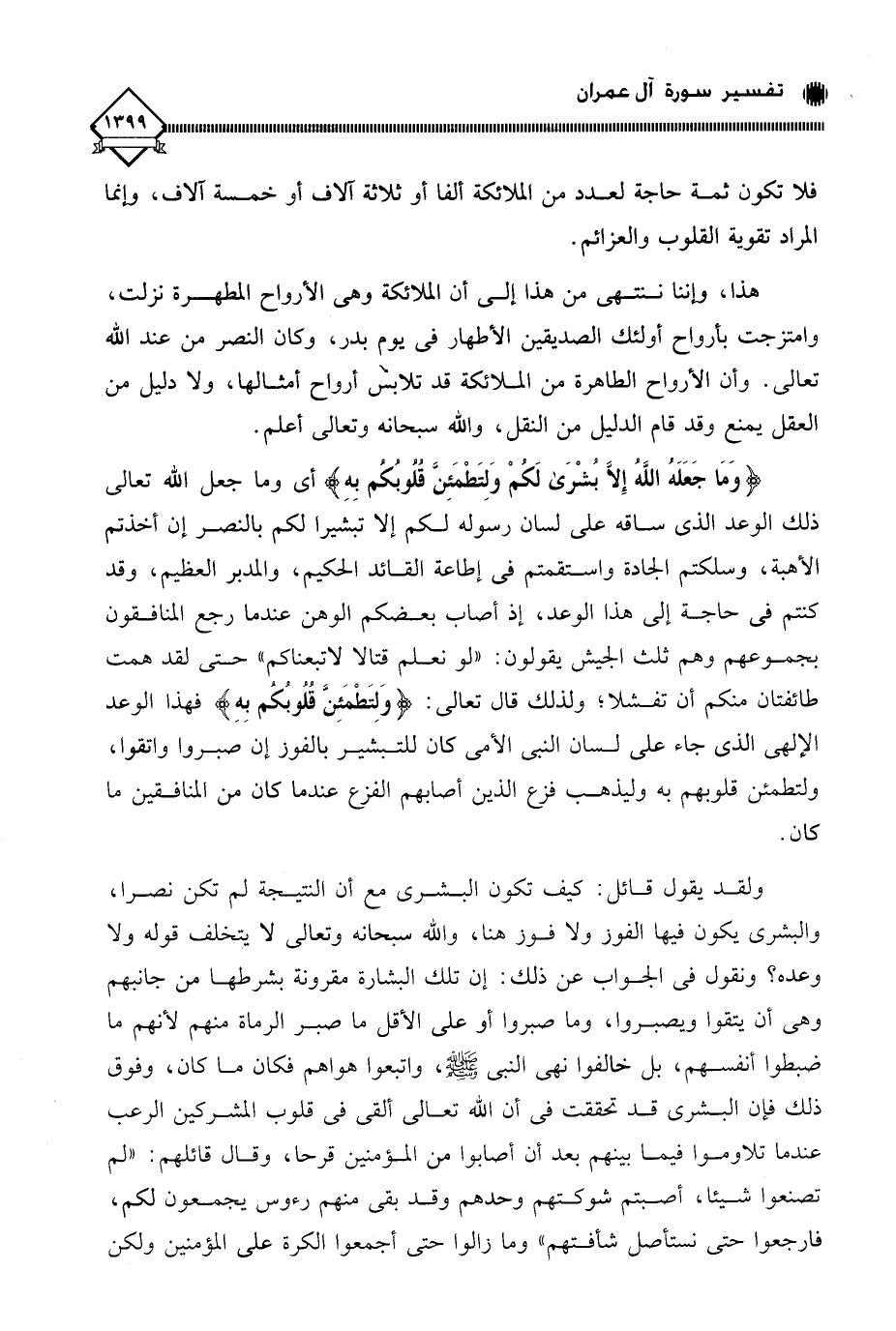 هذا، وإننا ننتهي من هذا إلى أن الملائكة وهي الأرواح المطهرة نزلت، وامتزجت بأرواح أولئك الصديقين الأطهار في يوم بدر، وكان النصر من عند الله تعالى. وأن الأرواح الطاهرة من الملائكة قد تلابس أرواح أمثالها، ولا دليل من العقل يمنع وقد قام الدليل من النقل، والله سبحانه وتعالى أعلم.