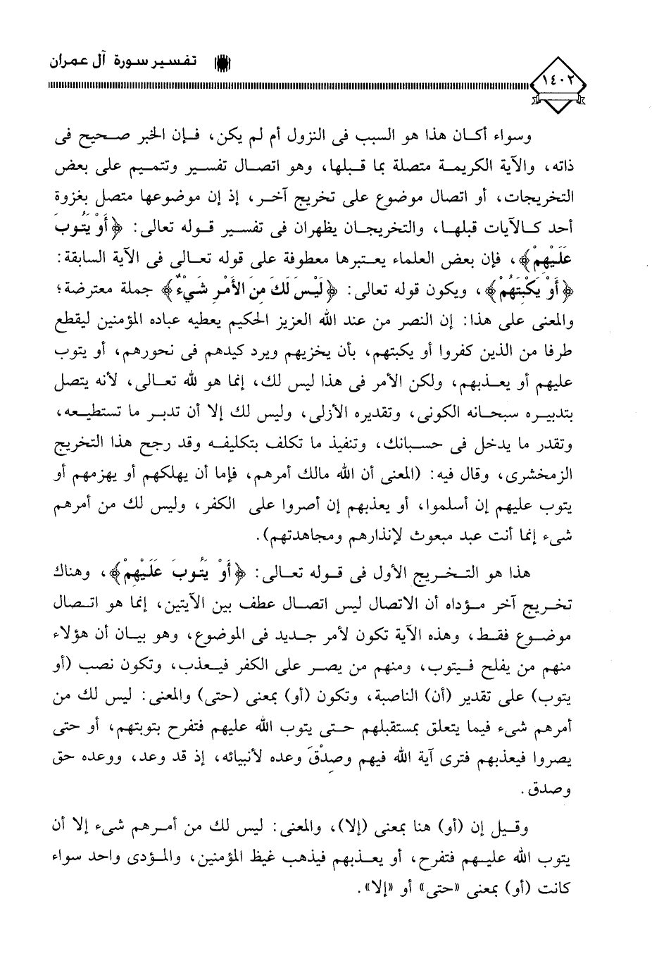 هذا هو التخريج الأول في قوله تعالى: (أَوْ يَتُوبَ عَلَيْهمْ)، وهناك تخريج آخر مؤداه أن الاتصال ليس اتصال عطف بين الآيتين، إنما هو اتصال موضوع فقط، وهذه الآية تكون لأمر جديد في الموضوع، وهو بيان أن هؤلاء منهم من يفلح فيتوب، ومنهم من يصر على الكفر فيعذب، وتكون نصب (أو يتوب) على تقدير (أن) الناصبة، وتكون (أو) بمعنى (حتي) والمعنى: ليس لك من أمرهم شيء فيما يتعلق بمستقبلهم حتى يتوب الله عليهم فتفرح بتوبتهم، أو حتى يصروا فيعذبهم فترى آية الله فيهم وصِدْقَ وعده لأنبيائه، إذ قد وعد، ووعده حق وصدق.