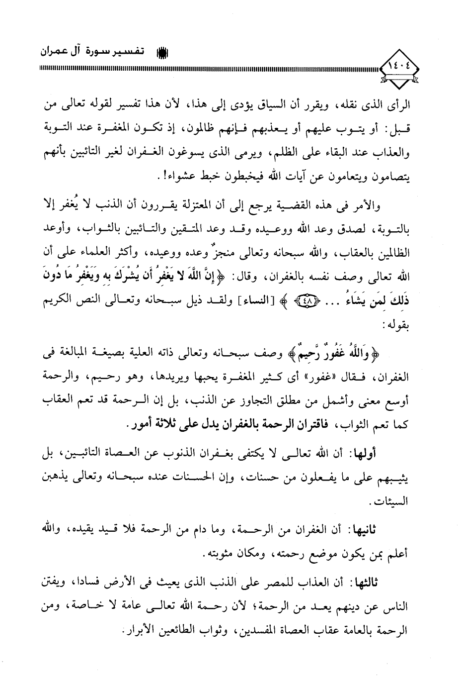 الرأي الذي نقله، ويقرر أن السياق يؤدي إلى هذا، لأن هذا تفسير لقوله تعالى من قبل: أو يتوب عليهم أو يعذبهم فإنهم ظالمون، إذ تكون المغفرة عند التوبة والعذاب عند البقاء على الظلم، ويرمى الذي يسوغون الغفران لغير التائبين بأنهم يتصامون ويتعامون عن آيات الله فيخبطون خبط عشواء!.