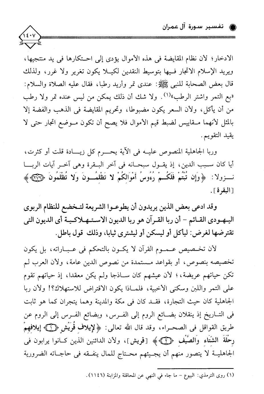 وقد ادعى بعض الذين يريدون أن يطوعوا الشريعة لتخضع للنظام الربوي اليهودي القائم - أن ربا القرآن هو ربا الديون الاستهلاكية أي الديون التي تقترضها لغرض: ليأكل أو ليسكن أو ليشترى ثيابا، وذلك قول باطل؛ لأن تخصيص عموم القرآن لَا يكون بالتحكم في عباراته، بل يكون تخصيصه بنصوص، أو بقواعد مستمدة من نصوص الدين عامة، ولأن العرب لم تكن حياتهم عريضة،؛ لأن عيشهم كان ساذجا ولم يكن معقدا، إذ حياتهم تقوم على التمر واللبن وسكنى الأخبية، فلماذا يكون الاقتراض للاستهلاك؟! ولأن ربا الجاهلية كان حيث التجارة، فقد كان في مكة والمدينة وهما يتجران كما هو ثابت في التاريخ إذ ينقلان بضائع الروم إلى الفرس، وبضائع الفرس إلى الروم عن طريق القواقل في الصحراء، وقد قال الله تعالى: (لِإِيلَافِ قُرَيْشٍ (1) إِيلَافِهِمْ رِحْلَةَ الشِّتَاءِ وَالصَّيْفِ (2)، ولأن الدائنين الذين كانوا يرابون في الجاهلية لَا يتصور منهم أن يجيئهم محتاج للمال ينفقه في حاجاته الضرورية