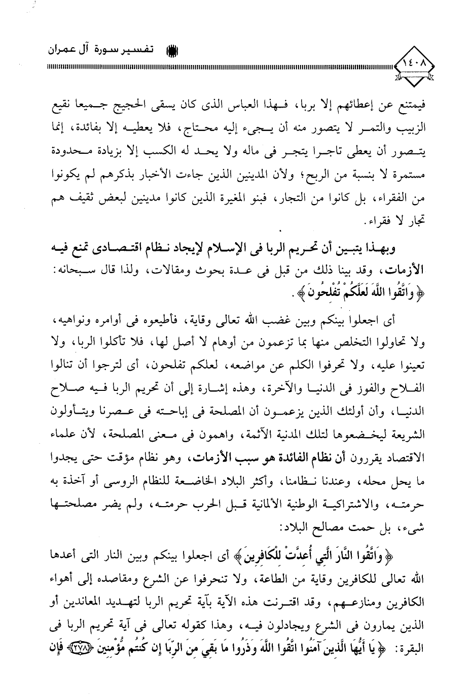 وبهذا يتبين أن تحريم الربا في الإسلام لإيجاد نظام اقتصادي تمنع فيه الأزمات، وقد بينا ذلك من قبل في عدة بحوث ومقالات، ولذا قال سبحانه: (وَاتَّقُوا اللَّهَ لَعَلَّكمْ تفْلِحُونَ).