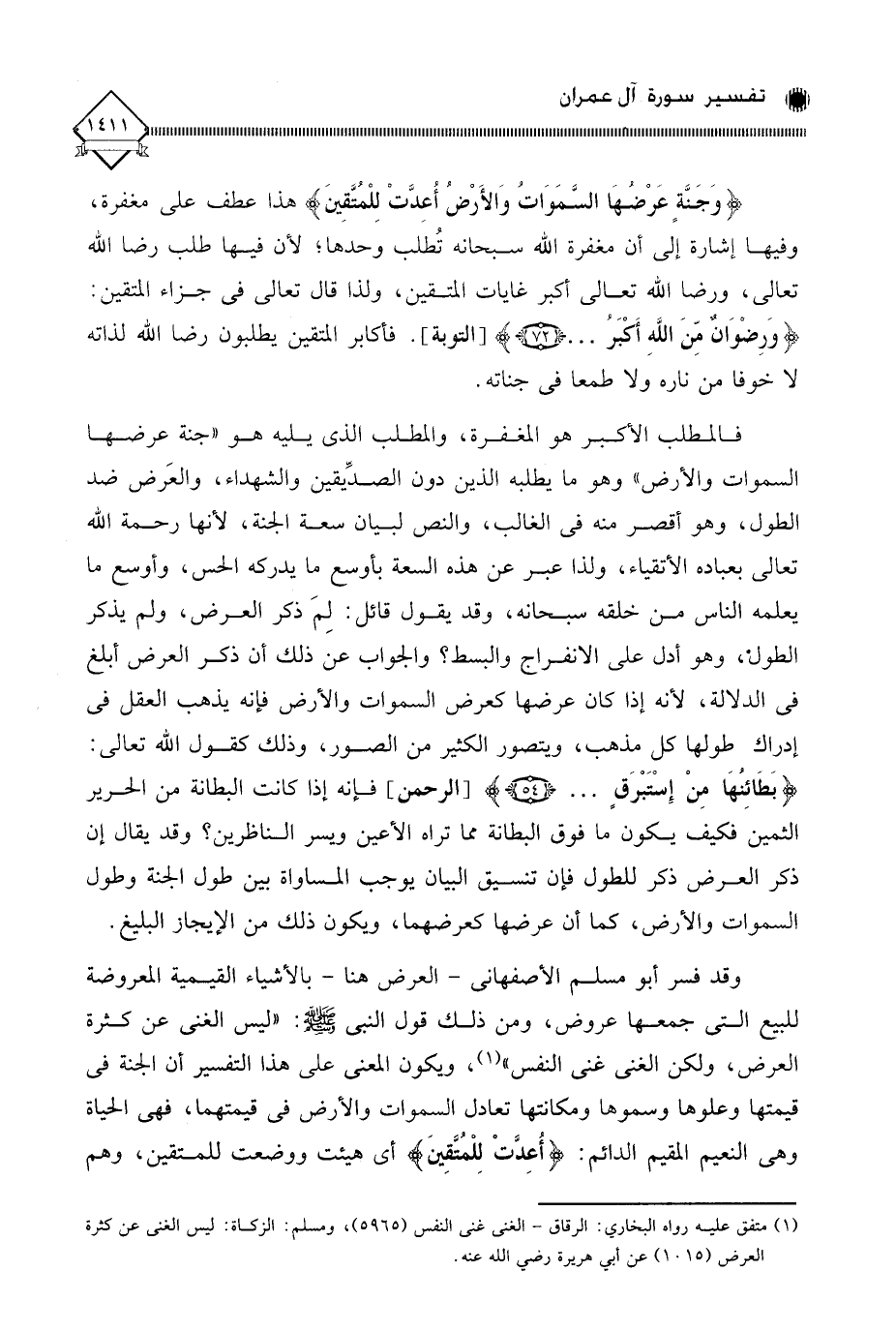 وقد فسر أبو مسلم الأصفهاني - العرض هنا - بالأشياء القيمية المعروضة للبيع التي جمعها عروض، ومن ذلك قول النبي - صلى الله عليه وسلم -: " ليس الغنى عن كثرة العرض، ولكن الغنى غنى النفس " (¬1)، ويكون المعنى على هذا التفسير أن الجنة في قيمتها وعلوها وسموها ومكانتها تعادل السماوات والأرض في قيمتهما، فهي الحياة وهي النعيم المقيم الدائم: (أُعِدَّتْ لِلْمُتَقِينَ) أي هيئت ووضعت للمتقين، وهم