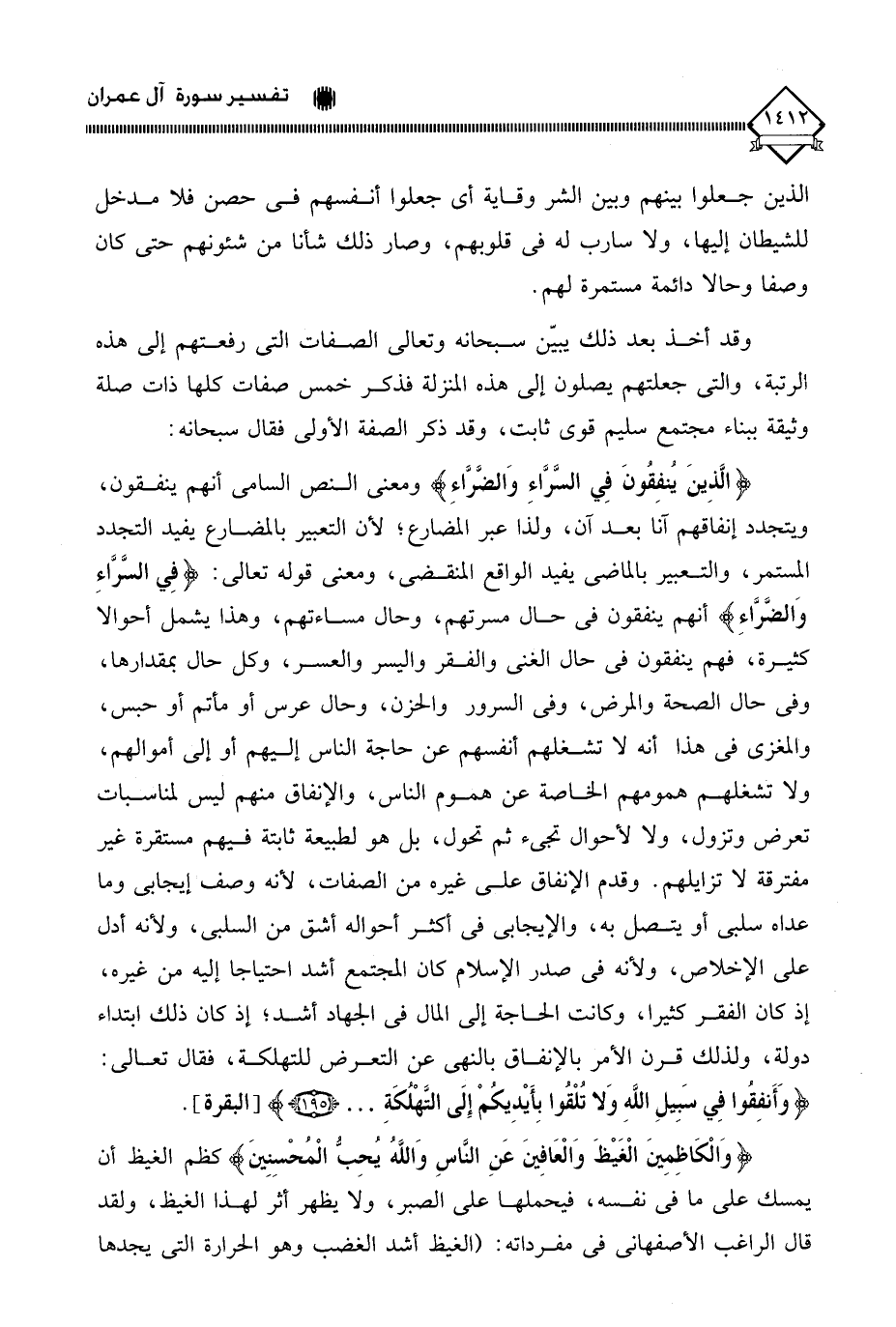 ومعنى النص السامي أنهم ينفقون، ويتجدد إنفاقهم آنًا بعد آنٍ، ولذا عبر المضارع؛ لأن التعبير بالمضارع يفيد التجدد المستمر، والتعبير بالماضي يفيد الواقع المنقضي، ومعنى قوله تعالى: (فِي السَّرَّاءِ وَالضَّرَّاءِ) أنهم ينفقون في حال مسرتهم، وحال مساءتهم، وهذا يشمل أحوالا كثيرة، فهم ينفقون في حال الغنى والفقر واليسر والعسر، وكل حال بمقدارها، وفى حال الصحة والمرض، وفي السرور والحزن، وحال عرس أو مأتم أو حبس، والمغزى في هذا أنه لَا تشغلهم أنفسهم عن حاجة الناس إليهم أو إلى أموالهم، ولا تشغلهم همومهم الخاصة عن هموم الناس، والإنفاق منهم ليس لمناسبات تعرض وتزول، ولا لأحوال تجيء ثم تحول، بل هو لطبيعة ثابتة فيهم مستقرة غير مفترقة لَا تزايلهم. وقدم الإنفاق على غيره من الصفات، لأنه وصف إيجابي وما عداه سلبي أو يتصل به، والإيجابي في أكثر أحواله أشق من السلبي، ولأنه أدل على الإخلاص، ولأنه في صدر الإسلام كان المجتمع أشد احتياجا إليه من غيره، إذ كان الفقر كثيرا، وكانت الحاجة إلى المال في الجهاد أشد؛ إذ كان ذلك ابتداء دولة، ولذلك قرن الأمر بالإنفاق بالنهي عن التعرض للتهلكة، فقال تعالى: (وَأَنفِقوا فِي سَبِيلِ اللَّهِ وَلا تُلْقُوا بِأَيْدِيكُمْ إِلَى التَّهْلكَةِ. . .).