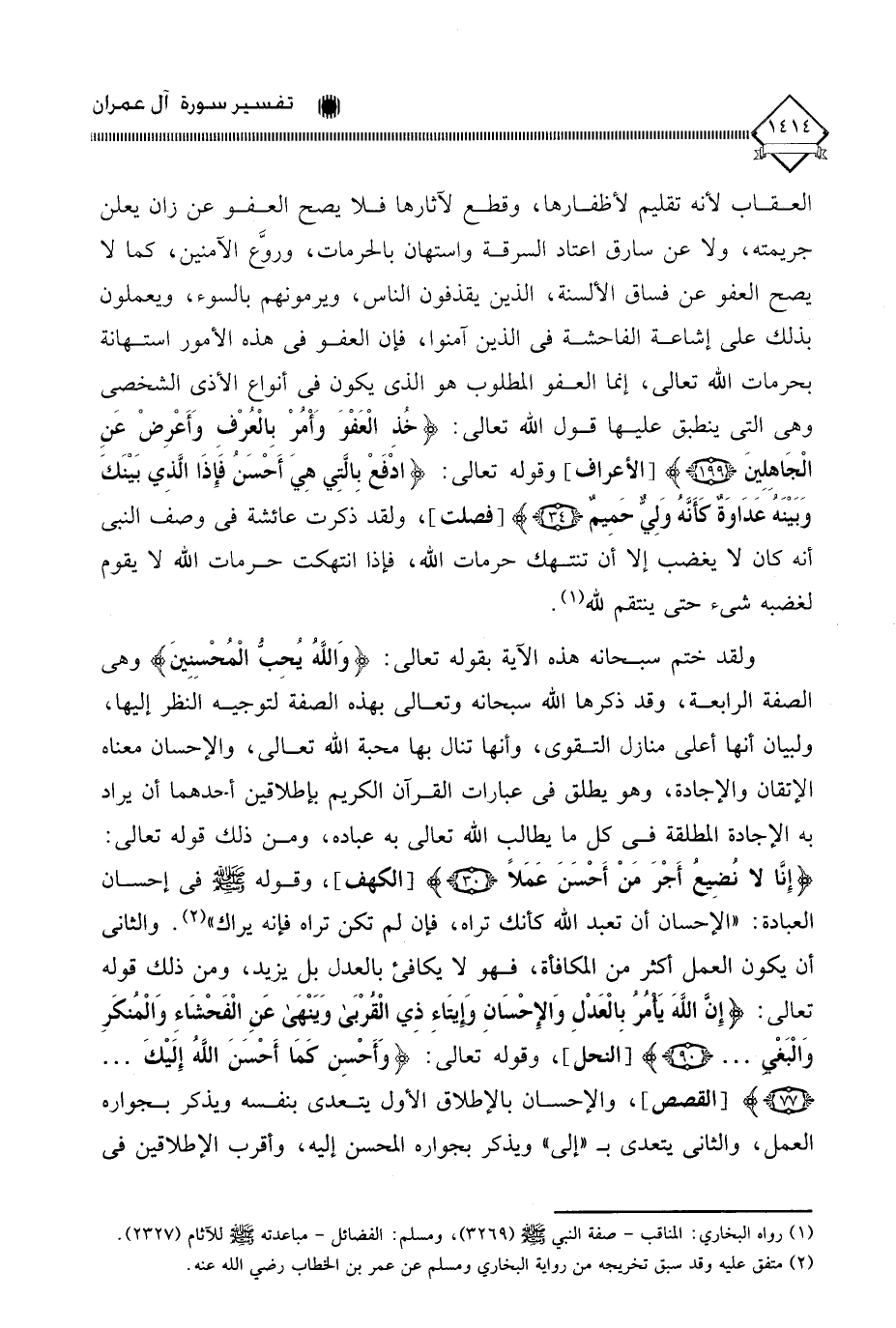 والثاني: أن يكون العمل أكثر من المكافأة، فهو لَا يكافئ بالعدل بل يزيد، ومن ذلك قوله تعالى: (إِنَّ اللَّهَ يَامُرُ بِالْعَدْلِ وَالإِحْسَانِ وَإيتَاءِ ذي الْقرْبَى وَيَنْهى عَنِ الْفَحْشَاءِ وَالْمُنكَرِ وَالْبَغْيِ. . .)، وقوله تعالى: (وَأَحْسِن كَمَا أَحْسَنَ اللَّهُ إِلَيْكَ. . .)، والإحسان بالإطلاق الأول يتعدى بنفسه ويذكر بجواره العمل، والثاني يتعدى بـ " إلى " ويذكر بجواره المحسن إليه، وأقرب الإطلاقين في