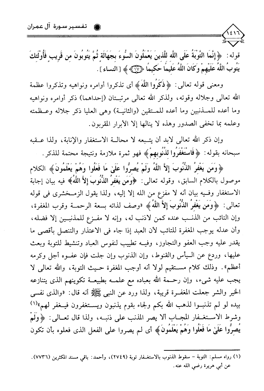 قوله: (إِنَّمَا التَّوْبَةُ عَلَى اللَّهِ لِلَّذِينَ يَعْمَلُونَ السُّوءَ بِجَهَالَةٍ ثُمَّ يَتُوبُونَ مِنْ قَرِيبٍ فَأُولَئِكَ يَتُوبُ اللَّهُ عَلَيْهِمْ وَكَانَ اللَّهُ عَلِيمًا حَكِيمًا (17). ومعنى قوله تعالى: (ذَكَرُوا اللَّهَ) أي تذكروا أوامره ونواهيه وتذكروا عظمة الله تعالى وجلاله وقوته، ولذكر الله تعالى مرتبتان (إحداهما) ذكر أوامره ونواهيه وما أعده للمذنبين وما أعده للمتقين (والثانية) وهي العليا ذكر جلاله وعظمته وعلمه بما تخفي الصدور وهذه لَا ينالها إلا الأبرار المقربون.
