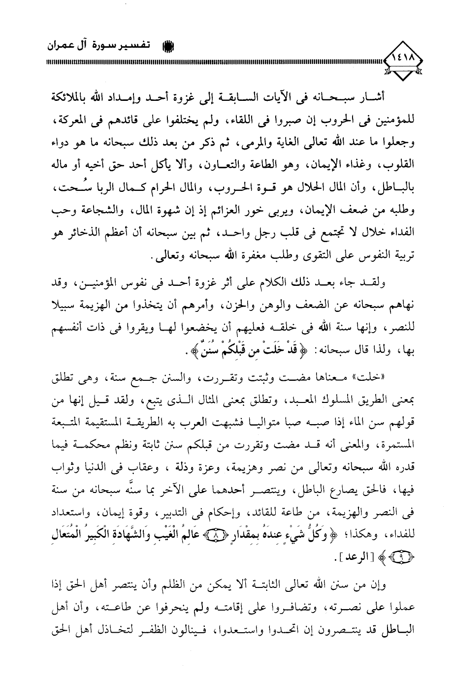 " خلت " معناها مضت وثبتت وتقررت، والسنن جمع سنة، وهي تطلق بمعنى الطريق المسلوك المعبد، وتطلق بمعنى المثال الذي يتبع، ولقد قيل إنها من قولهم سن الماء إذا صبه صبا متواليا فشبهت العرب به الطريقة المستقيمة المتبعة المستمرة، والمعنى أنه قد مضت وتقررت من قبلكم سنن ثابتة ونظم محكمة فيما قدره الله سبحانه وتعالى من نصر وهزيمة، وعزة وذلة، وعقاب في الدنيا وثواب فيها، فالحق يصارع الباطل، وينتصر أحدهما على الآخر بما سنَّه سبحانه من سنة في النصر والهزيمة، من طاعة للقائد، وإحكام في التدبير، وقوة إيمان، واستعداد للفداء، وهكذا، (وَكُلُّ شَيْءٍ عِنْدَهُ بِمِقْدَارٍ (8) عَالِمُ الْغَيْبِ وَالشَّهَادَةِ الْكَبِيرُ الْمُتَعَالِ (9).