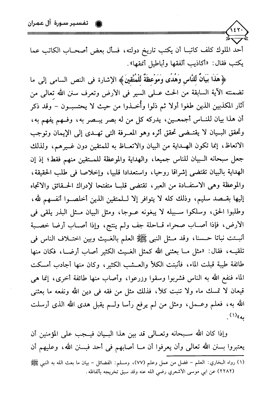 الإشارة في النص السامي إلى ما تضمنته الآية السابقة من الحث على السير في الأرض وتعرف سنن الله تعالى من آثار المكذبين الذين طغوا أولا ثم ذلوا وأُخذوا من حيث لَا يحتسبون - وقد ذكر أن هذا بيان للناس أجمعين، يدركه كل من له بصر يبصر به، وفهم يفهم به، وتحقق البيان لَا يقتضي تحقق أثره وهو المعرفة التي تهدي إلى الإيمان وتوجب الاتعاظ، إنما تكون الهداية من البيان والاتعاظ به للمتقين دون غيرهم، ولذلك جعل سبحانه البيان للناس جميعا، والهداية والموعظة للمتقين منهم فقط؛ إذ إن الهداية بالبيان تقتضي إشراقا روحيا، واستعدادا قلبيا، وإخلاصا في طلب الحقيقة، والموعظة وهي الاستفادة من العبر، تقتضي قلبا متفتحا لإدراك الحقائق والاتجاه إليها بقصد سليم، وذلك كله لَا يتوافر إلا للمتقين الذين أخلصوا أنفسهم لله، وطلبوا الحق، وسلكوا سبيله لَا يبغونه عوجا، ومثل البيان مثل البذر يلقى في الأرض، فإذا أصاب صحراء قاحلة جف ولم ينتج، وإذا أصاب أرضا خصبة أنبتت نباتا حسنا، وقد مثل النبي - صلى الله عليه وسلم - العلم بالغيث وبين اختلاف الناس في تلقيه، فقال: " مَثَلُ مَا بَعَثَنِي اللَّهُ بِهِ مِنَ الهُدَى وَالعِلْمِ، كَمَثَلِ الغَيْثِ الكَثِيرِ أَصَابَ أَرْضًا، فَكَانَ مِنْهَا نَقِيَّةٌ، قَبِلَتِ المَاءَ، فَأَنْبَتَتِ الكَلَأَ وَالعُشْبَ الكَثِيرَ، وَكَانَتْ مِنْهَا أَجَادِبُ، أَمْسَكَتِ المَاءَ، فَنَفَعَ اللَّهُ بِهَا النَّاسَ، فَشَرِبُوا وَسَقَوْا وَزَرَعُوا، وَأَصَابَتْ مِنْهَا طَائِفَةً أُخْرَى، إِنَّمَا هِيَ قِيعَانٌ لاَ تُمْسِكُ مَاءً وَلاَ تُنْبِتُ كَلَأً، فَذَلِكَ مَثَلُ مَنْ فَقُهَ فِي دِينِ اللَّهِ، وَنَفَعَهُ مَا بَعَثَنِي اللَّهُ بِهِ فَعَلِمَ وَعَلَّمَ، وَمَثَلُ مَنْ لَمْ يَرْفَعْ بِذَلِكَ رَأْسًا، وَلَمْ يَقْبَلْ هُدَى اللَّهِ الَّذِي أُرْسِلْتُ بِهِ " (¬1).
