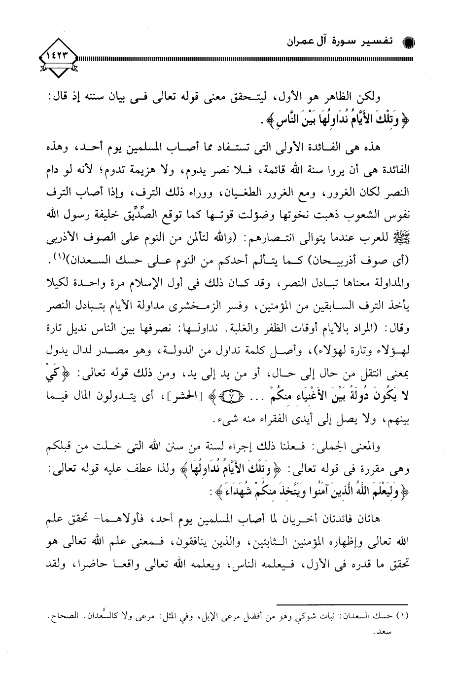هذه هي الفائدة الأولى التي تستفاد مما أصاب المسلمين يوم أحد، وهذه الفائدة هي أن يروا سنة الله قائمة، فلا نصر يدوم، ولا هزيمة تدوم، لأنه لو دام النصر لكان الغرور، ومع الغرور الطغيان، ووراء ذلك الترف، وإذا أصاب الترف نفوس الشعوب ذهبت نخوتها وضؤلت قوتها كما توقع الصِّدِّيق خليفة رسول الله - صلى الله عليه وسلم - للعرب عندما يتوالى انتصارهم: (والله لتألمن من النوم على الصوف الأذربى (أي صوف أذربيحان) كما يتألم أحدكم من النوم على حسك السعدان) (¬1).