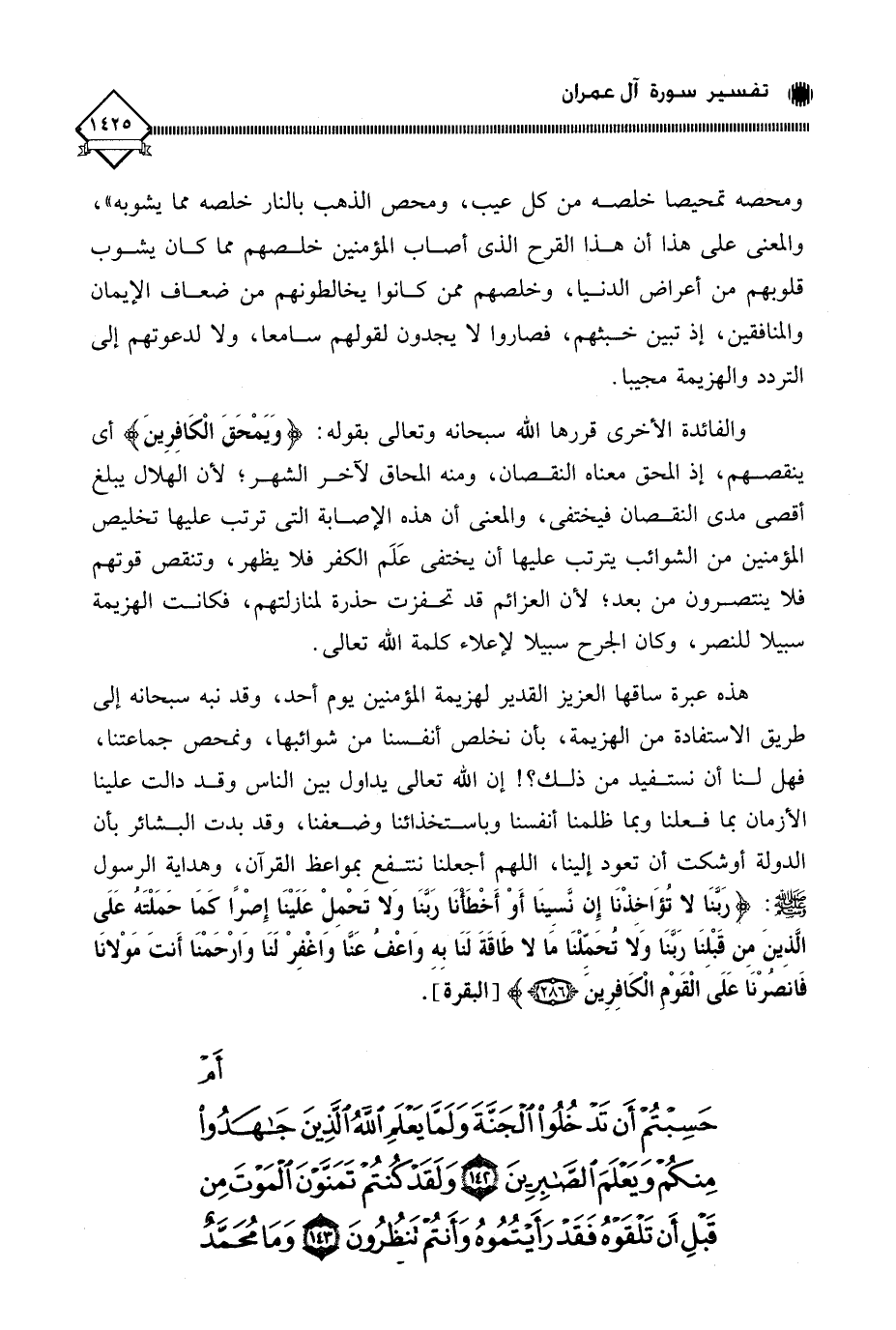 هذه عبرة ساقها العزيز القدير لهزيمة المؤمنين يوم أحد، وقد نبه سبحانه إلى طريق الاستفادة من الهزيمة، بأن نخلص أنفسنا من شوائبها، ونمحص جماعتنا، فهل لنا أن نستفيد من ذلك؟! إن الله تعالى يداول بين الناس وقد دالت علينا الأزمان بما فعلنا وبما ظلمنا أنفسنا وباستخذائنا وضعفنا، وقد بدت البشائر بأن الدولة أوشكت أن تعود إلينا، اللهم أجعلنا ننتِفع بمواعظ القرآن، وهداية الرسول - صلى الله عليه وسلم -: (رَبَّنَا لَا تُؤَاخِذْنَا إِنْ نَسِينَا أَوْ أَخْطَأْنَا رَبَّنَا وَلَا تَحْمِلْ عَلَيْنَا إِصْرًا كَمَا حَمَلْتَهُ عَلَى الَّذِينَ مِنْ قَبْلِنَا رَبَّنَا وَلَا تُحَمِّلْنَا مَا لَا طَاقَةَ لَنَا بِهِ وَاعْفُ عَنَّا وَاغْفِرْ لَنَا وَارْحَمْنَا أَنْتَ مَوْلَانَا فَانْصُرْنَا عَلَى الْقَوْمِ الْكَافِرِينَ (286).