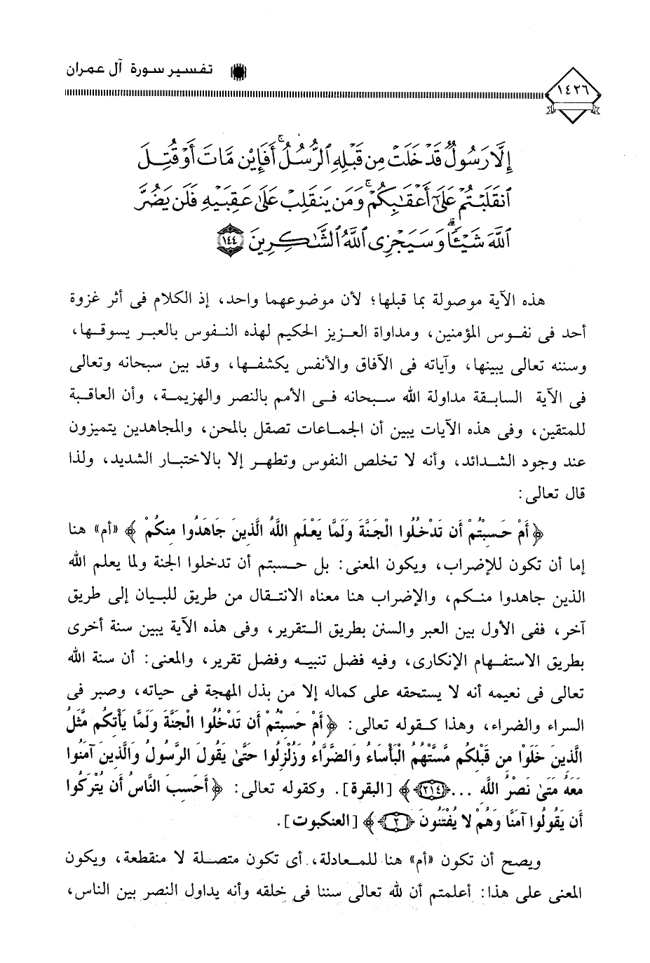 (أَمْ حَسِبْتُمْ أَن تَدْخُلُوا الْجَنةَ وَلَمَّا يَعْلَم اللَّهُ الَّذِينَ جَاهَدُوا مِنكمْ) " أم " هنا إما أن تكون للإضراب، ويكون المعنى: بل حسبتم أن تدخلوا الجنة ولما يعلم الله الذين جاهدوا منكم، والإضراب هنا معناه الانتقال من طريق للبيان إلى طريق آخر، ففي الأول بين العبر والسنن بطريق التقرير، وفي هذه الآية يبين سنة أخرى بطريق الاستفهام الإنكاري، وفيه فضل تنبيه وفضل تقرير، والمعنى: أن سنة الله تعالى في نعيمه أنه لَا يستحقه على كماله إلا من بذل المهجة في حياته، وصبر في السراء والضراء، وهذا كقوله تعالى: (أَمْ حَسِبْتُمْ أَنْ تَدْخُلُوا الْجَنَّةَ وَلَمَّا يَأْتِكُمْ مَثَلُ الَّذِينَ خَلَوْا مِنْ قَبْلِكُمْ مَسَّتْهُمُ الْبَأْسَاءُ وَالضَّرَّاءُ وَزُلْزِلُوا حَتَّى يَقُولَ الرَّسُولُ وَالَّذِينَ آمَنُوا مَعَهُ مَتَى نَصْرُ اللَّهِ. . .). وكقوله تعالى: (أَحَسِبَ النَّاسُ أَن يُتْرَكُوا أَن يَقُولُوا آمَنَّا وَهُمْ لَا يُفْثَنونَ).