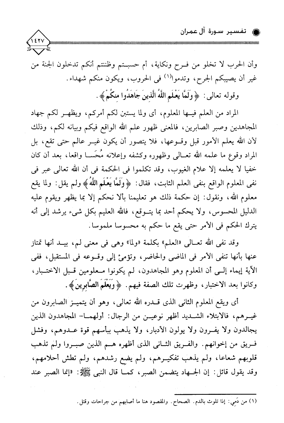 المراد من العلم فيها المعلوم، أي ولا يستبن لكم أمركم، ويظهر لكم جهاد المجاهدين وصبر الصابرين، فالمعنى ظهور علم الله الواقع فيكم وبيانه لكم، وذلك لأن الله يعلم الأمور قبل وقوعها، فلا يتصور أن يكون غير عالم حتى تقع، بل المراد وقوع ما علمه الله تعالى وظهوره وكشفه وإعلانه مُحَسا واقعا، بعد أن كان خفيا لَا يعلمه إلا علام الغيوب، وقد تكلموا في الحكمة في أن الله تعالى عبر في نفي المعلوم الواقع بنفي العلم الثابت، فقال: (وَلَمَّا يَعْلَم اللَّهُ) ولم يقل: ولا يقع معلوم الله، ونقول: إن حكمة ذلك هو تعليمنا بألا نحكم إلا بما يظهر ويقوم عليه الدليل المحسوس، ولا يحكم أحد بما يتوقع، فالله العليم بكل شيء يرشد إلى أنه يترك الحكم في الأمر حتى يقع ما حكم به محسوسا ملموسا.