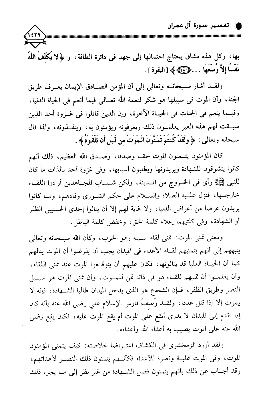 ولقد أورد الزمخشري في الكشاف اعتراضا خلاصته: كيف يتمنى المؤمنون الموت، وفي الموت غلبة ونصرة للأعداء فكأنهم يتمنون ذلك النصر لأعدائهم؟ وقد أجاب عن ذلك بأنهم يتمنون فضل الشهادة من غير نظر إلى ما يجره ذلك