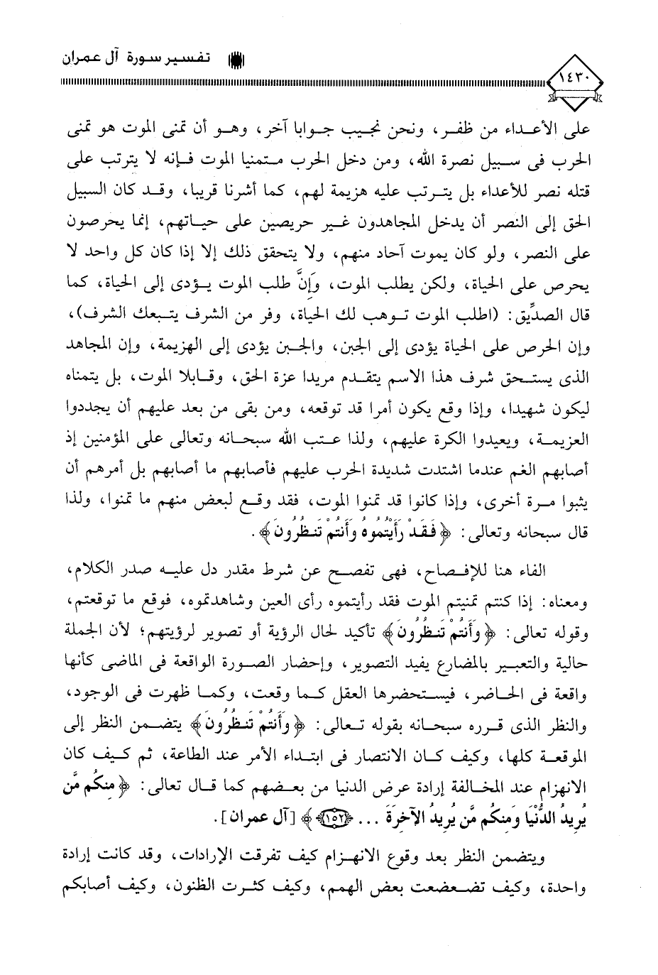 على الأعداء من ظفر، ونحن نجيب جوابا آخر، وهو أن تمنى الموت هو تمنى الحرب في سبيل نصرة الله، ومن دخل الحرب متمنيا الموت فإنه لَا يترتب على قتله نصر للأعداء بل يترتب عليه هزيمة لهم، كما أشرنا قريبا، وقد كان السبيل الحق إلى النصر أن يدخل المجاهدون غير حريصين على حياتهم، إنما يحرصون على النصر، ولو كان يموت آحاد منهم، ولا يتحقق ذلك إلا إذا كان كل واحد لا يحرص على الحياة، ولكن يطلب الموت، وَإِنَّ طلب الموت يؤدي إلى الحياة، كما قال الصدِّيق: (اطلب الموت توهب لك الحياة، وفر من الشرف يتبعك الشرف)، وإن الحرص على الحياة يؤدي إلى الجبن، والجبن يؤدي إلى الهزيمة، وإن المجاهد الذي يستحق شرف هذا الاسم يتقدم مريدا عزة الحق، وقابلا الموت، بل يتمناه ليكون شهيدا، وإذا وقع يكون أمرا قد توقعه، ومن بقي من بعد عليهم أن يجددوا العزيمة، ويعيدوا الكرة عليهم، ولذا عتب الله سبحانه وتعالى على المؤمنين إذ أصابهم الغم عندما اشتدت شديدة الحرب عليهم فأصابهم ما أصابهم بل أمرهم أن يثبوا مرة أخرى، وإذا كانوا قد تمنوا الموت، فقد وقع لبعض منهم ما تمنوا، ولذا قال سبحانه وتعالى: (فَقَدْ رَأَيْتُمُوهُ وَأَنتُمْ تَنظُرُونَ).