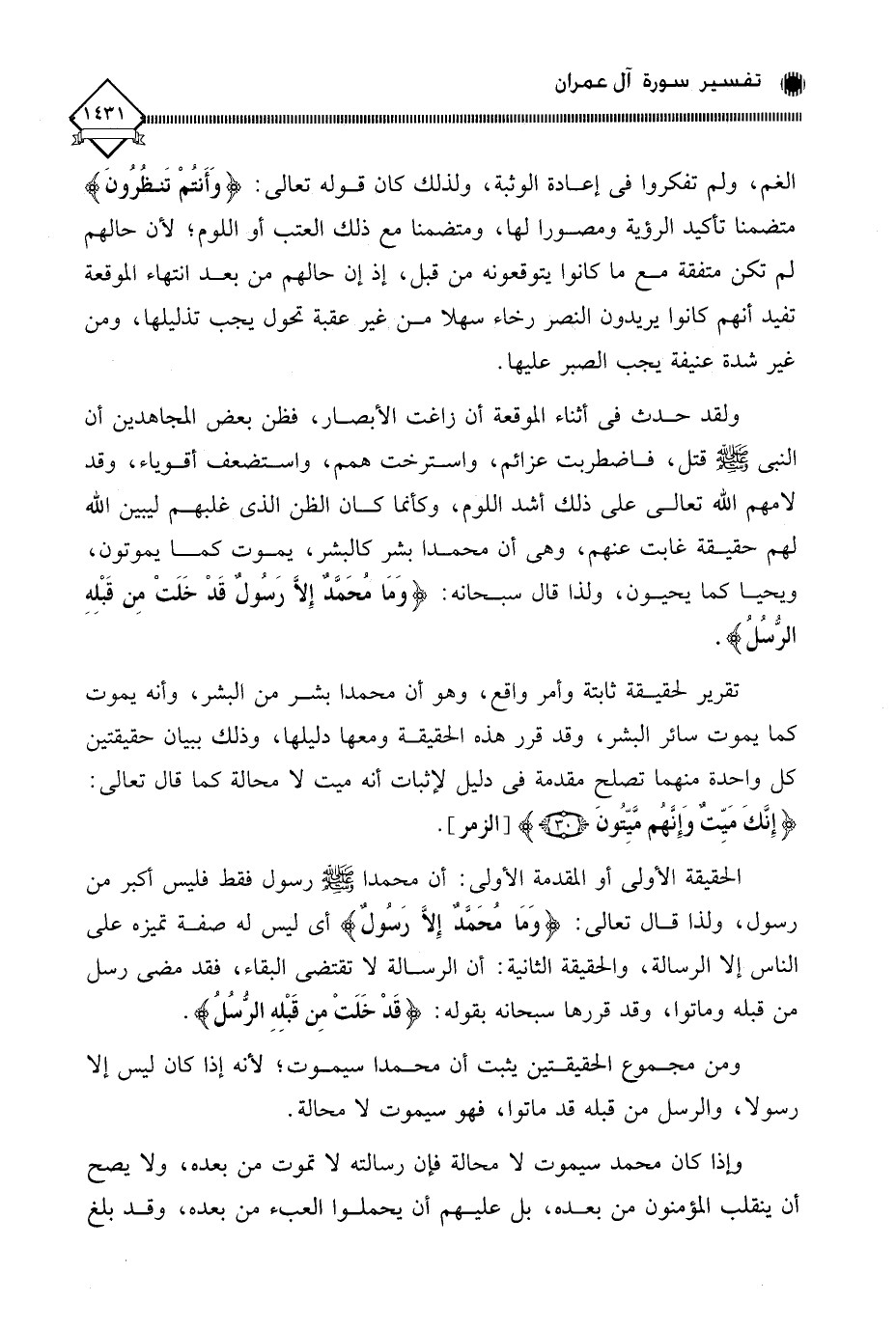 وإذا كان محمد سيموت لَا محالة فإن رسالته لَا تموت من بعده، ولا يصح أن ينقلب المؤمنون من بعده، بل عليهم أن يحملوا العبء من بعده، وقد بلغ
