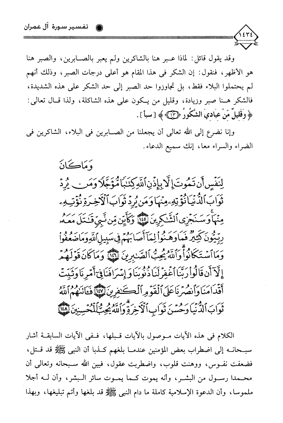 (وَمَا كَانَ لِنَفْسٍ أَنْ تَمُوتَ إِلَّا بِإِذْنِ اللَّهِ كِتَابًا مُؤَجَّلًا وَمَنْ يُرِدْ ثَوَابَ الدُّنْيَا نُؤْتِهِ مِنْهَا وَمَنْ يُرِدْ ثَوَابَ الْآخِرَةِ نُؤْتِهِ مِنْهَا وَسَنَجْزِي الشَّاكِرِينَ (145) وَكَأَيِّنْ مِنْ نَبِيٍّ قَاتَلَ مَعَهُ رِبِّيُّونَ كَثِيرٌ فَمَا وَهَنُوا لِمَا أَصَابَهُمْ فِي سَبِيلِ اللَّهِ وَمَا ضَعُفُوا وَمَا اسْتَكَانُوا وَاللَّهُ يُحِبُّ الصَّابِرِينَ (146) وَمَا كَانَ قَوْلَهُمْ إِلَّا أَنْ قَالُوا رَبَّنَا اغْفِرْ لَنَا ذُنُوبَنَا وَإِسْرَافَنَا فِي أَمْرِنَا وَثَبِّتْ أَقْدَامَنَا وَانْصُرْنَا عَلَى الْقَوْمِ الْكَافِرِينَ (147) فَآتَاهُمُ اللَّهُ ثَوَابَ الدُّنْيَا وَحُسْنَ ثَوَابِ الْآخِرَةِ وَاللَّهُ يُحِبُّ الْمُحْسِنِينَ (148)