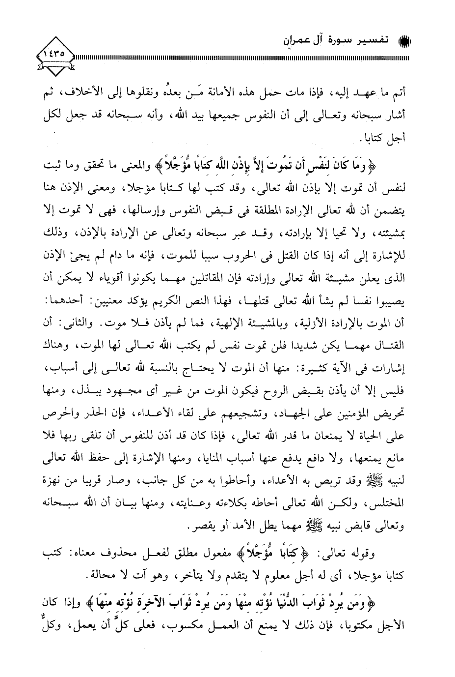 (وَمَا كَانَ لِنَفْسٍ أَن تَمُوتَ إِلَّا بِإِذْنِ اللَّهِ كِتَابًا مُّؤَجَّلًا) والمعنى ما تحقق وما ثبت لنفس أن تموت إلا بإذن الله تعالى، وقد كتب لها كتابا مؤجلا، ومعنى الإذن هنا يتضمن أن لله تعالى الإرادة المطلقة في قبض النفوس وإرسالها، فهي لَا تموت إلا بمشيئته، ولا تحيا إلا بإرادته، وقد عبر سبحانه وتعالى عن الإرادة بالإذن، وذلك للإشارة إلى أنه إذا كان القتل في الحروب سببا للموت، فإنه ما دام لم يجئ الإذن الذي يعلن مشيئة الله تعالى وإرادته فإن المقاتلين مهما يكونوا أقوياء لَا يمكن أن يصيبوا نفسا لم يشأ الله تعالى قتلها، فهذا النص الكريم يؤكد معنيين: أحدهما: أن الموت بالإرادة الأزلية، وبالمشيئة الإلهية، فما لم يأذن فلا موت. والثاني: أن القتال مهما يكن شديدا فلن تموت نفس لم يكتب الله تعالى لها الموت، وهناك إشارات في الآية كثيرة: منها أن الموت لَا يحتاج بالنسبة لله تعالى إلى أسباب، فليس إلا أن يأذن بقبض الروح فيكون الموت من غير أي مجهود يبذل، ومنها تحريض المؤمنين على الجهاد، وتشجيعهم على لقاء الأعداء، فإن الحذر والحرص على الحياة لَا يمنعان ما قدر الله تعالى، فإذا كان قد أذن للنفوس أن تلقى ربها فلا مانع يمنعها، ولا دافع يدفع عنها أسباب المنايا، ومنها الإشارة إلى حفظ الله تعالى لنبيه - صلى الله عليه وسلم - وقد تربص به الأعداء، وأحاطوا به من كل جانب، وصار قريبا من نهزة المختلس، ولكن الله تعالى أحاطه بكلاءته وعنايته، ومنها بيان أن الله سبحانه وتعالى قابض نبيه - صلى الله عليه وسلم - مهما يطل الأمد أو يقصر.