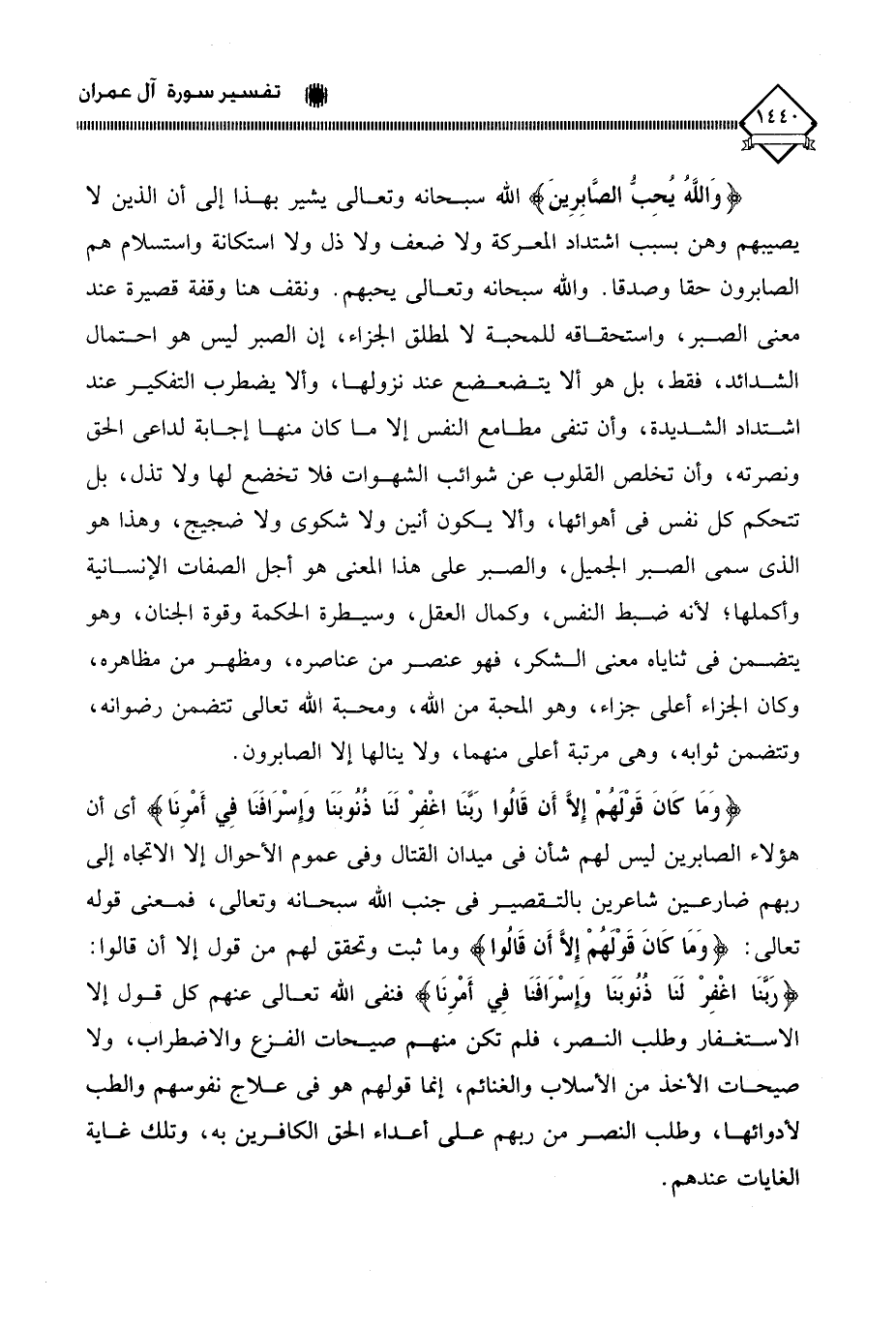 (وَاللَّهُ يُحِبُّ الصَّابِرِينَ) الله سبحانه وتعالى يشير بهذا إلى أن الذين لا يصيبهم وهن بسبب اشتداد المعركة ولا ضعف ولا ذل ولا استكانة واستسلام هم الصابرون حقا وصدقا. والله سبحانه وتعالى يحبهم. ونقف هنا وقفة قصيرة عند معنى الصبر، واستحقاقه للمحبة لَا لمطلق الجزاء، إن الصبر ليس هو احتمال الشدائد، فقط، بل هو ألا يتضعضع عند نزولها، وألا يضطرب التفكير عند اشتداد الشديدة، وأن تنفي مطامع النفس إلا ما كان منها إجابة لداعي الحق ونصرته، وأن تخلص القلوب عن شوائب الشهوات فلا تخضع لها ولا تذل، بل تتحكم كل نفس في أهوائها، وألا يكون أنين ولا شكوى ولا ضجيج، وهذا هو الذي سمى الصبر الجميل، والصبر على هذا المعنى هو أجل الصفات الإنسانية وأكملها؛ لأنه ضبط النفس، وكمال العقل، وسيطرة الحكمة وقوة الجنان، وهو يتضمن في ثناياه معنى الشكر، فهو عنصر من عناصره، ومظهر من مظاهره، وكان الجزاء أعلى جزاء، وهو المحبة من الله، ومحبة الله تعالى تتضمن رضوانه، وتتضمن ثوابه، وهي مرتبة أعلى منهما، ولا ينالها إلا الصابرون.