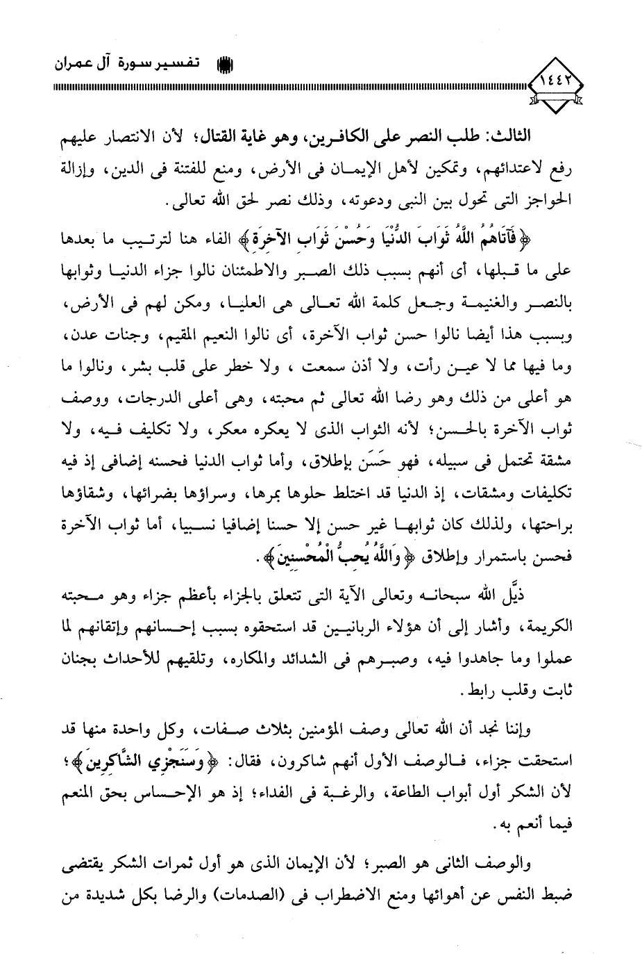 ذيَّل الله سبحانه وتعالى الآية التي تتعلق بالجزاء باعظم جزاء وهو محبته الكريمة، وأشار إلى أن هؤلاء الربانيين قد استحقوه بسبب إحسانهم وإتقانهم لما عملوا وما جاهدوا فيه، وصبرهم في الشدائد والمكاره، وتلقيهم للأحداث بجنان ثابت وقلب رابط.
