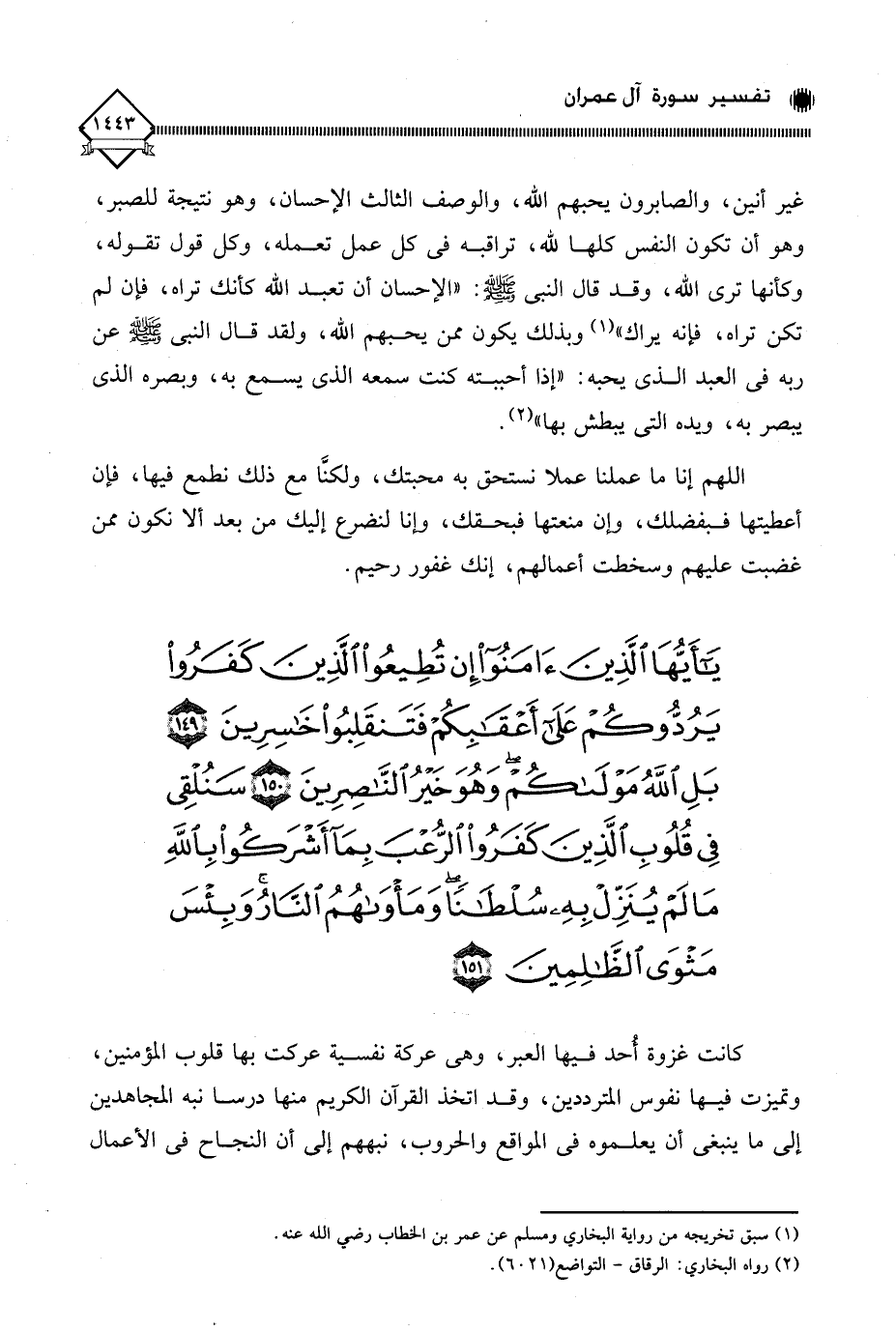 (يَا أَيُّهَا الَّذِينَ آمَنُوا إِنْ تُطِيعُوا الَّذِينَ كَفَرُوا يَرُدُّوكُمْ عَلَى أَعْقَابِكُمْ فَتَنْقَلِبُوا خَاسِرِينَ (149) بَلِ اللَّهُ مَوْلَاكُمْ وَهُوَ خَيْرُ النَّاصِرِينَ (150) سَنُلْقِي فِي قُلُوبِ الَّذِينَ كَفَرُوا الرُّعْبَ بِمَا أَشْرَكُوا بِاللَّهِ مَا لَمْ يُنَزِّلْ بِهِ سُلْطَانًا وَمَأْوَاهُمُ النَّارُ وَبِئْسَ مَثْوَى الظَّالِمِينَ (151)