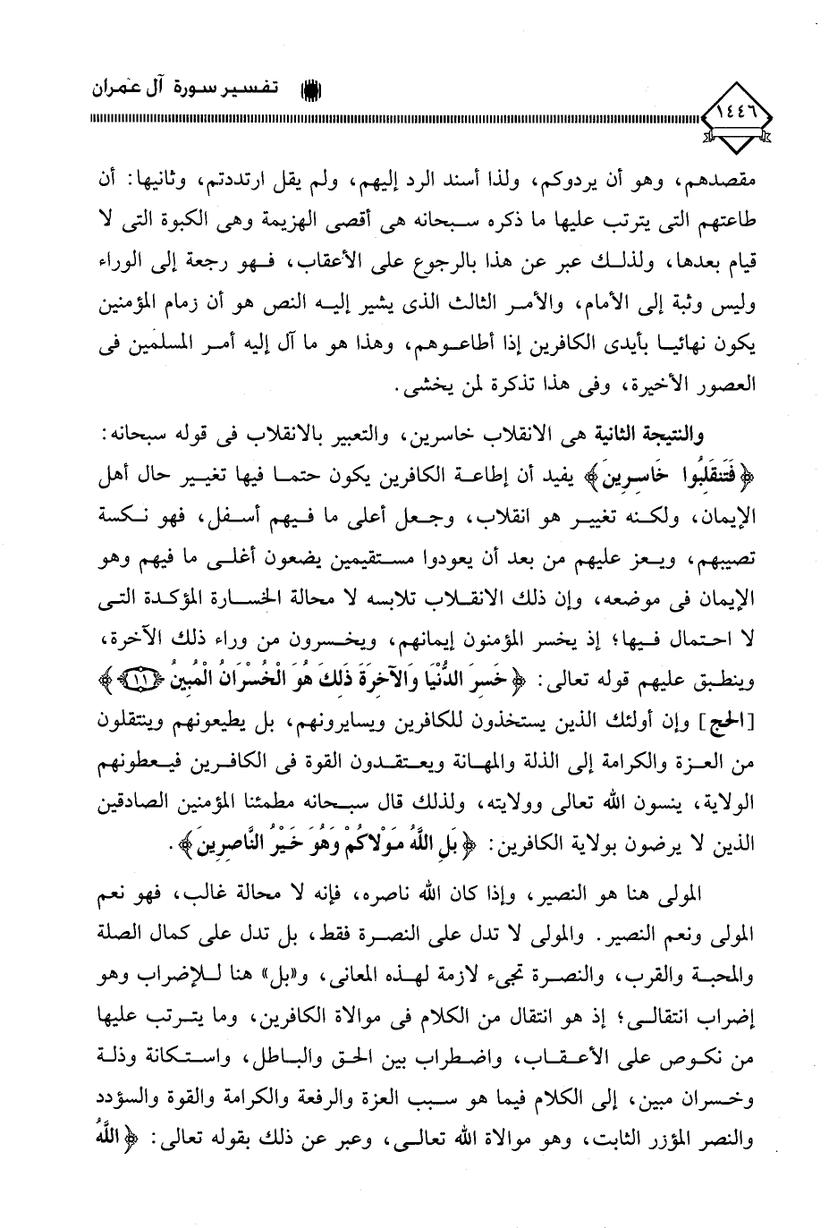 المولى هنا هو النصير، وإذا كان الله ناصره، فإنه لَا محالة غالب، فهو نعم المولى ونعم النصير. والمولى لَا تدل على النصرة فقط، بل تدل على كمال الصلة والمحبة والقرب، والنصرة تجيء لازمة لهذه المعاني، و " بل " هنا للإضراب وهو إضراب انتقالي؛ إذ هو انتقال من الكلام في موالاة الكافرين، وما يترتب عليها من نكوص على الأعقاب، واضطراب بين الحق والباطل، واستكانة وذلة وخسران مبين، إلى الكلام فيما هو سبب العزة والرفعة والكرامة والقوة والسؤدد والنصر المؤزر الثابت، وهو موالاة الله تعالى، وعبر عن ذلك بقوله تعالى: (اللَّهُ