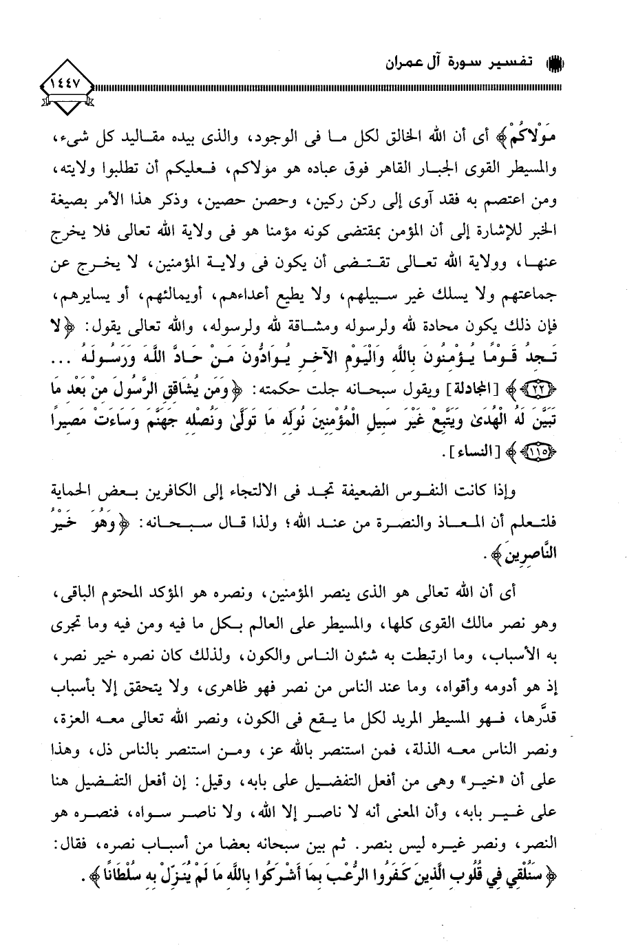 مَوْلاكمْ) أي أن الله الخالق لكل ما في الوجود، والذي بيده مقاليد كل شيء، والمسيطر القوي الجبار القاهر فوق عباده هو مولاكم، فعليكم أن تطلبوا ولايته، ومن اعتصم به فقد آوى إلى ركن ركين، وحصن حصين، وذكر هذا الأمر بصيغة الخبر للإشارة إلى أن المؤمن بمقتضى كونه مؤمنا هو في ولاية الله تعالى فلا يخرج عنها، وولاية الله تعالى تقتضي أن يكون في ولاية المؤمنين، لَا يخرج عن جماعتهم ولا يسلك غير سبيلهم، ولا يطيع أعداءهم، أو يمالئهم، أو يسايرهم، فإن ذلك يكون محادة لله ولرسوله ومشاقة لله ولرسوله، والله تعالى يقول: (لا تَجدُ قَوْمًا يؤْمِنُونَ بِاللَّهِ وَالْيَوْمِ الآخِرِ يُوَادُّونَ مَن حَادَّ اللَّهَ ورَسُولَهُ. . .)، ويقول سبحانه جلت حكمته: (وَمَنْ يُشَاقِقِ الرَّسُولَ مِنْ بَعْدِ مَا تَبَيَّنَ لَهُ الْهُدَى وَيَتَّبِعْ غَيْرَ سَبِيلِ الْمُؤْمِنِينَ نُوَلِّهِ مَا تَوَلَّى وَنُصْلِهِ جَهَنَّمَ وَسَاءَتْ مَصِيرًا (115).