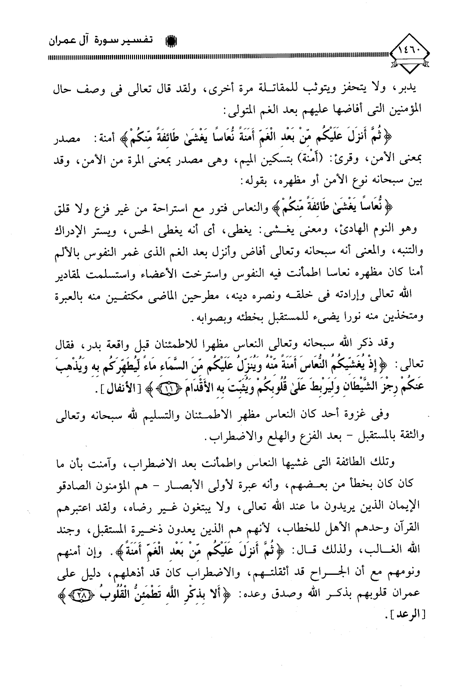 (نُعَاسًا يَغْشَى طَائِفَةً مِنْكُمْ) والنعاس فتور مع استراحة من غير فزع ولا قلق وهو النوم الهادئ، ومعنى يغشى: يغطي، أي أنه يغطي الحس، ويستر الإدراك والتنبه، والمعنى أنه سبحانه وتعالى أفاض وأنزل بعد الغم الذي غمر النفوس بالألم أمنا كان مظهره نعاسا اطمأنت فيه النفوس واسترخت الأعضاء واستسلمت لمقادير الله تعالى وإرادته في خلقه ونصره دينه، مطرحين الماضي مكتفين منه بالعبرة ومتخذين منه نورا يضيء للمستقبل بخطئه وبصوابه.
