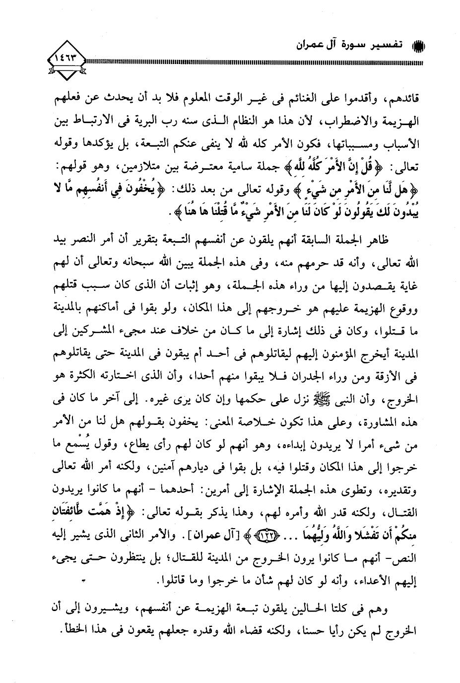 قائدهم، وأقدموا على الغنائم في غير الوقت المعلوم فلا بد أن يحدث عن فعلهم الهزيمة والاضطراب، لأن هذا هو النظام الذي سنه رب البرية في الارتباط بين الأسباب ومسبباتها، فكون الأمر كله لله لَا ينفي عنكم التبعة، بل يؤكدها وقوله تعالى: (قلْ إِنَّ الأَمْرَ كلَّهُ للًه) جملة سامية معترضة بين متلازمين، وهو قولهم: (هَل لَّنَا مِنَ الأَمْرِ مِن شَيْءٍ) وقوله تعالى من بعد ذلك: (يُخْفُونَ فِي أَنْفُسِهِمْ مَا لَا يُبْدُونَ لَكَ يَقُولُونَ لَوْ كَانَ لَنَا مِنَ الْأَمْرِ شَيْءٌ مَا قُتِلْنَا هَاهُنَا). ظاهر الجملة السابقة أنهم يلقون عن أنفسهم التبعة بتقرير أن أمر النصر بيد الله تعالى، وأنه قد حرمهم منه، وفي هذه الجملة يبين الله سبحانه وتعالى أن لهم غاية يقصدون إليها من وراء هذه الجملة، وهو إثبات أن الذي كان سبب قتلهم ووقوع الهزيمة عليهم هو خروجهم إلى هذا المكان، ولو بقوا في أماكنهم بالمدينة ما قتلوا، وكان في ذلك إشارة إلى ما كان من خلاف عند مجيء المشركين إلى المدينة أيخرج المؤمنون إليهم ليقاتلوهم في أحد أم يبقون في المدينة حتى يقاتلوهم في الأزقة ومن وراء الجدران فلا يبقوا منهم أحدا، وأن الذي اختارته الكثرة هو الخروج، وأن النبي - صلى الله عليه وسلم - نزل على حكمها وإن كان يرى غيره. إلى آخر ما كان في هذه المشاورة، وعلى هذا تكون خلاصة المعنى: يخفون بقولهم هل لنا من الأمر من شيء أمرا لَا يريدون إبداءه، وهو أنهم لو كان لهم رأى يطاع، وقول يُسمع ما خرجوا إلى هذا المكان وقتلوا فيه، بل بقوا في ديارهم آمنين، ولكنه أمر الله تعالى وتقديره، وتطوى هذه الجملة الإشارة إلى أمرين: أحدهما - أنهم ما كانوا يريدون القتال، ولكنه قدر الله وأمره لهم، وهذا يذكر بقوله تعالى: (إِذْ هَمَّت طَائِفَتَانِ مِنكُمْ أَن تَفْشَلا وَاللَّه وَلِيهُمَا. . .). والأمر الثاني الذي يشير إليه النص - أنهم ما كانوا يرون الخروج من المدينة للقتال؛ بل ينتظرون حتى يجيء إليهم الأعداء، وأنه لو كان لهم شأن ما خرجوا وما قاتلوا.