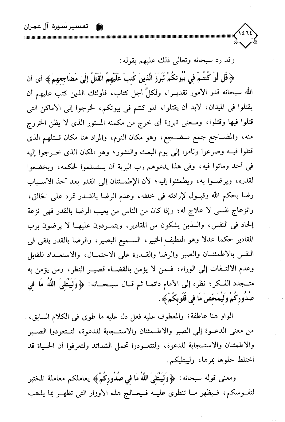 (قُل لَّوْ كُنتُمْ فِي بُيُوتِكُمْ لَبَرَزَ الَّذينَ كتِبَ عَلَيْهِمُ الْقَتْلُ إِلَى مَضَاجِعِهِمْ) أي أن الله سبحانه قدر الأمور تقديرا، ولكلِّ أجل كتاب، فأولئك الذين كتب عليهم أن يقتلوا في الميدان، لابد أن يقتلوا، فلو كنتم في بيوتكم، لخرجوا إلى الأماكن التي قتلوا فيها وقتلوا، ومعنى " برز " أي خرج من مكمنه المستور الذي لَا يظن الخروج منه، والمضاجع جمع مضجع، وهو مكان النوم، والمراد هنا مكان قتلهم الذي قتلوا فيه وصرعوا وناموا إلى يوم البعث والنشور؛ وهو المكان الذي خرجوا إليه في أحد وماتوا فيه، وفي هذا يدعوهم رب البرية أن يستسلموا لحكمه، ويخضعوا لقدره، ويرضوا به، ويطمئنوا إليه؛ لأن الاطمئنان إلى القدر بعد أخذ الأسباب رضا بحكم الله وقبول لإرادته في خلقه، وعدم الرضا بالقدر تمرد على الخالق، وانزعاج نفسي لَا علاج له؛ وإذا كان من الناس من يعيب الرضا بالقدر فهي نزعة إلحاد في النفس، والذين يشكون من المقادير، ويتمردون عليها لَا يرضون برب المقادير حكما عدلا وهو اللطيف الخبير، السميع البصير، والرضا بالقدر يلقي في النفس بالاطمئنان والصبر والرضا والقدرة على الاحتمال، والاستعداد للقابل وعدم الالتفات إلى الوراء، فمن لَا يؤمن بالقضاء قصير النظر، ومن يؤمن به متجدد الفكر؛ نظره إلى الأمام دائما ثم قال سبحانه: (وَلِيَبْتَلِيَ اللَّهَ مَا فِيْ صُدُورِكُمْ وَلِيُمَحِّصَ مَا فِي قُلُوبِكُمْ).