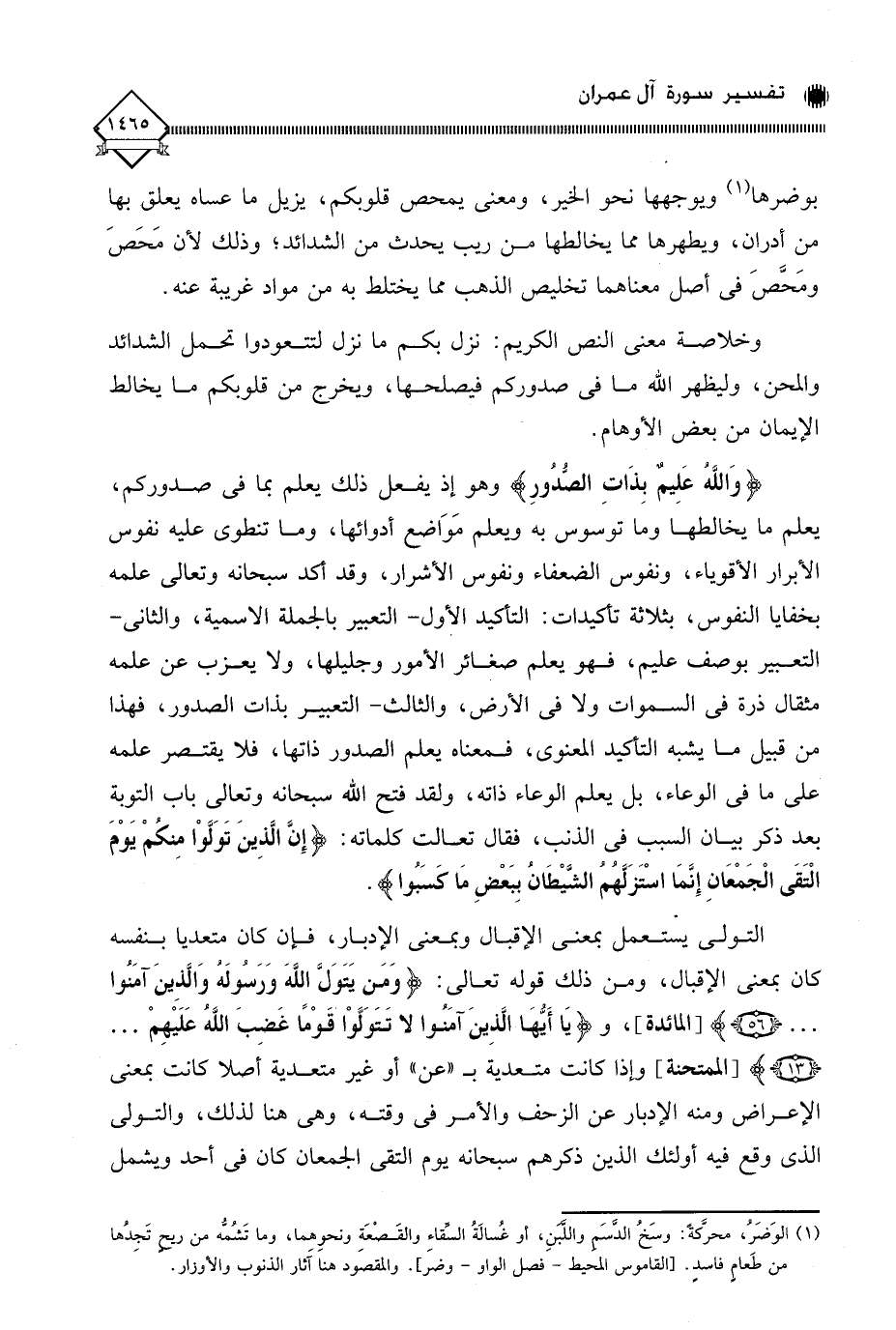(وَاللَّهُ عَلِيمٌ بِذَاتِ الصُّدُورِ) وهو إذ يفعل ذلك يعلم بما في صدوركم، يعلم ما يخالطها وما توسوس به ويعلم مَوَاضع أدوائها، وما تنطوي عليه نفوس الأبرار الأقوياء، ونفوس الضعفاء ونفوس الأشرار، وقد أكد سبحانه وتعالى علمه بخفايا النفوس، بثلاثة تأكيدات: التأكيد الأول - التعبير بالجملة الاسمية، والثاني - التعبير بوصف عليم، فهو يعلم صغائر الأمور وجليلها، ولا يعزب عن علمه مثقال ذرة في السماوات ولا في الأرض، والثالث - التعبير بذات الصدور، فهذا من قبيل ما يشبه التأكيد المعنوي، فمعناه يعلم الصدور ذاتها، فلا يقتصر علمه على ما في الوعاء، بل يعلم الوعاء ذاته، ولقد فتح الله سبحانه وتعالى باب التوبة بعد ذكر بيان السبب في الذنب، فقال تعالت كلماته: