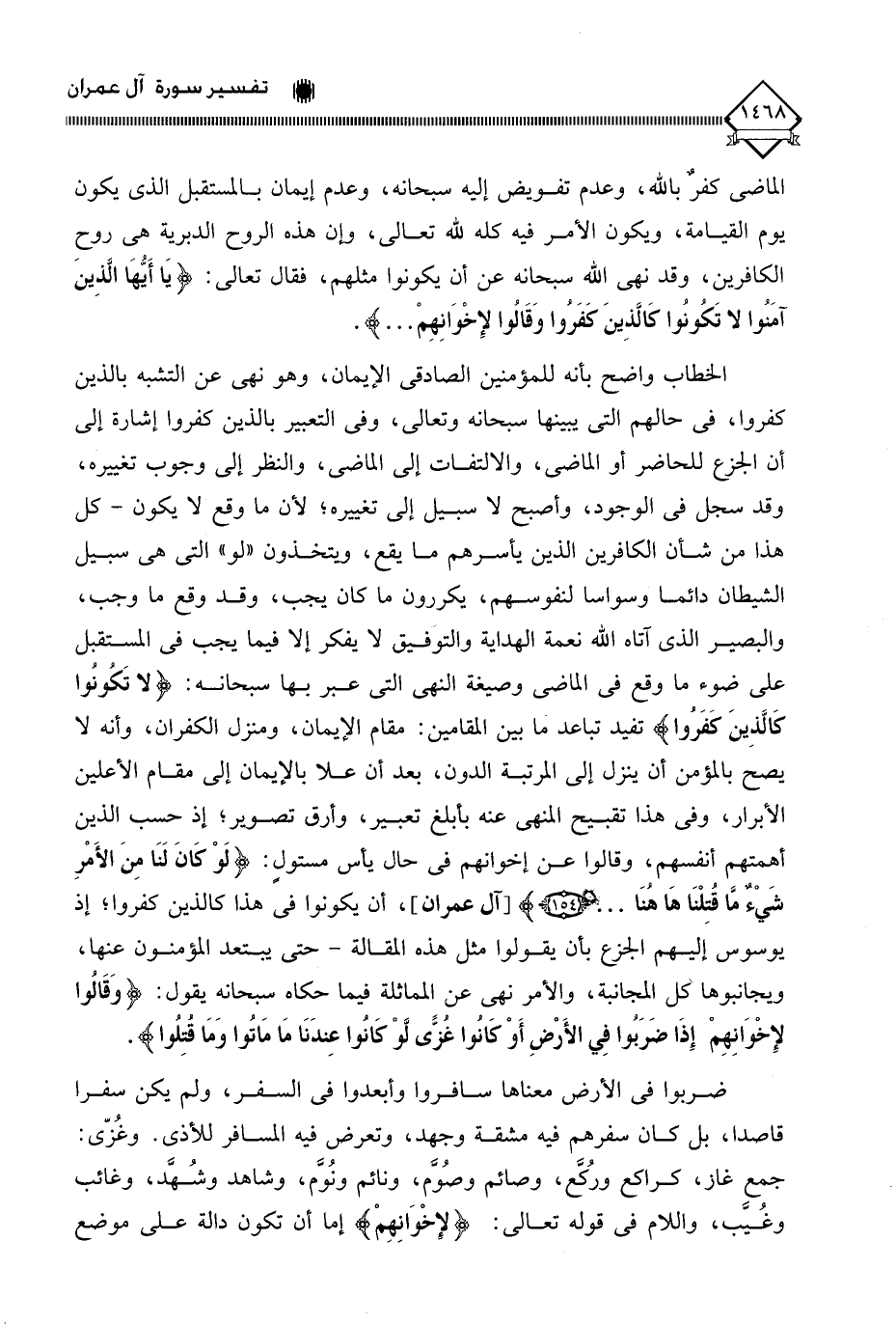 الخطاب واضح بأنه للمؤمنين الصادقي الإيمان، وهو نهي عن التشبه بالذين كفروا، في حالهم التي يبينها سبحانه وتعالى، وفي التعبير بالذين كفروا إشارة إلى أن الجزع للحاضر أو الماضي، والالتفات إلى الماضي، والنظر إلى وجوب تغييره، وقد سجل في الوجود، وأصبح لَا سبيل إلى تغييره؛ لأن ما وقع لَا يكون - كل هذا من شأن الكافرين الذين يأسرهم ما يقع، ويتخذون " لو " التي هي سبيل الشيطان دائما وسواسا لنفوسهم، يكررون ما كان يجب، وقد وقع ما وجب، والبصير الذي آتاه الله نعمة الهداية والتوفيق لَا يفكر إلا فيما يجب في المستقبل على ضوء ما وقع في الماضي وصيغة النهي التي عبر بها سبحانه: (لاتَكونوا كَالَّذِينَ كَفَروا) تفيد تباعد ما بين المقامين: مقام الإيمان، ومنزل الكفران، وأنه لا يصح بالمؤمن أن ينزل إلى المرتبة الدون، بعد أن علا بالإيمان إلى مقام الأعلين الأبرار، وفي هذا تقبيح المنهي عنه بأبلغ تعبير، وأرق تصوير؛ إذ حسب الذين أهمتهم أنفسهم، وقالوا عن إخوانهم في حال يأس مستولٍ: (لَوْ كَانَ لَنَا مِنَ الأَمرِ شَيْءٌ ما قُتِلْنَا هَا هُنَا. .)، أن يكونوا في هذا كالذين كفروا؛ إذ يوسوس إليهم الجزع بأن يقولوا مثل هذه المقالة - حتى يبتعد المؤمنون عنها، ويجانبوها كل المجانبة، والأمر نهي عن المماثلة فيما حكاه سبحانه يقول: (وَقَالُوا لِإِخْوَانِهِمْ إِذَا ضَرَبُوا فِي الْأَرْضِ أَوْ كَانُوا غُزًّى لَوْ كَانُوا عِنْدَنَا مَا مَاتُوا وَمَا قُتِلُوا).