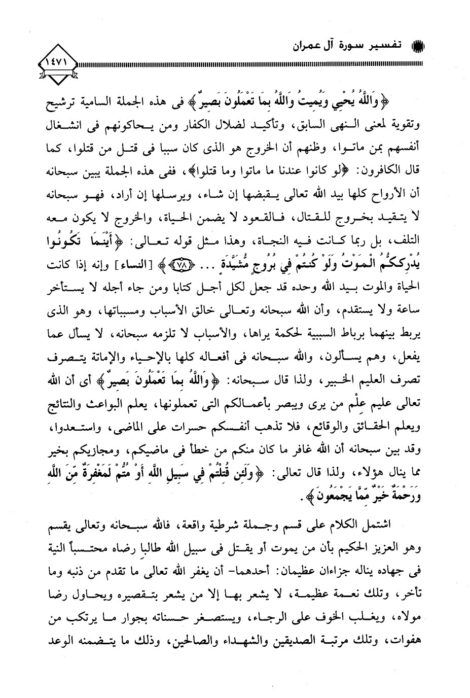 (وَاللَّهُ يُحْيِي وَيُمِيتُ وَاللَّهُ بِمَا تَعْمَلُونَ بَصِيرٌ) في هذه الجملة السامية ترشيح وتقوية لمعنى النهي السابق، وتأكيد لضلال الكفار ومن يحاكونهم في انشغال أنفسهم بمن ماتوا، وظنهم أن الخروج هو الذي كان سببا في قتل من قتلوا، كما قال الكافرون: (لو كانوا عندنا ما ماتوا وما قتلوا)، ففي هذه الجملة يبين سبحانه أن الأرواح كلها بيد الله تعالى يقبضها إن شاء، ويرسلها إن أراد، فهو سبحانه لا يتقيد بخروج للقتال، فالقعود لَا يضمن الحياة، والخروج لَا يكون معه التلف، بل ربما كانت فيه النجاة، وهذا مثل قوله تعالى: (أَيْنَمَا تَكونُوا يُدْرِككّمُ الْمَوْت وَلَوْ كنتُمْ فِي بروجٍ مُّشَيَّدَة. . .)، وإنه إذا كانت الحياة والموت بيد الله وحده قد جعل لكل أجل كتابا ومن جاء أجله لَا يستأخر ساعة ولا يستقدم، وأن الله سبحانه وتعالى خالق الأسباب ومسبباتها، وهو الذي يربط بينهما برباط السببية لحكمة يراها، والأسباب لَا تلزمه سبحانه، لَا يسأل عما يفعل، وهم يسألون، والله سبحانه في أفعاله كلها بالإحياء والإماتة يتصرف تصرف العليم الخبير، ولذا قال سبحانه: (وَاللَّهُ بِمَا تَعْمَلُونَ بَصِيرٌ) أي أن الله تعالى عليم عِلْم من يرى ويبصر بأعمالكم التي تعملونها، يعلم البواعث والنتائج ويعلم الحقائق والوقائع، فلا تذهب أنفسكم حسرات على الماضي، واستعدوا، وقد بين سبحانه أن الله غافر ما كان منكم من خطأ في ماضيكم، ومجازيكم بخير مما ينال هؤلاء، ولذا قال تعالى: