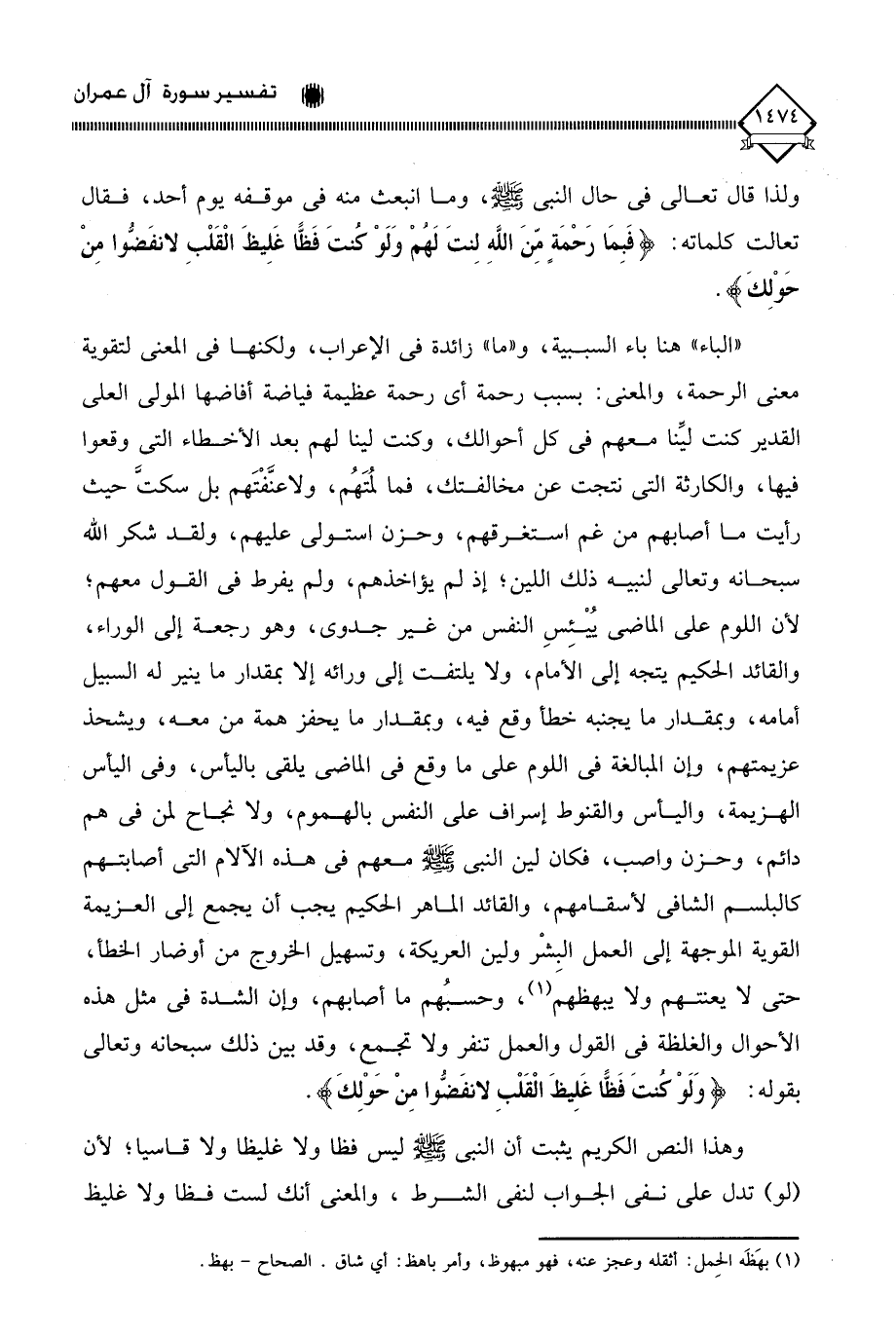 " الباء " هنا باء السببية، و " ما " زائدة في الإعراب، ولكنها في المعنى لتقوية معنى الرحمة، والمعنى: بسبب رحمة أي رحمة عظيمة فياضة أفاضها المولى العلي القدير كنت لئنا معهم في كل أحوالك، وكنت لينا لهم بعد الأخطاء التي وقعوا فيها، والكارثة التي نتجت عن مخالفتك، فما لمُتَهُم، ولا عنَّفْتَهم بل سكت حيث رأيت ما أصابهم من غم استغرقهم، وحزن استولى عليهم، ولقد شكر الله سبحانه وتعالى لنبيه ذلك اللين؛ إذ لم يؤاخذهم، ولم يفرط في القول معهم؛ لأن اللوم على الماضي يُيئس النفس من غير جدوى، وهو رجعة إلى الوراء، والقائد الحكيم يتجه إلى الأمام، ولا يلتفت إلى ورائه إلا بمقدار ما ينير له السبيل أمامه، وبمقدار ما يجنبه خطأ وقع فيه، وبمقدار ما يحفز همة من معه، ويشحذ عزيمتهم، وإن المبالغة في اللوم على ما وقع في الماضي يلقى باليأس، وفي اليأس الهزيمة، واليأس والقنوط إسراف على النفس بالهموم، ولا نجاح لمن في هم دائم، وحزن واصب، فكان لين النبي - صلى الله عليه وسلم - معهم في هذه الآلام التي أصابتهم كالبلسم الشافي لأسقامهم، والقائد الماهر الحكيم يجب أن يجمع إلى العزيمة القوية الموجهة إلى العمل البِشْر ولين العريكة، وتسهيل الخروج من أوضار الخطأ، حتى لَا يعنتهم ولا يبهظهم (¬1)، وحسبُهم ما أصابهم، وإن الشدة في مثل هذه الأحوال والغلظة في القول والعمل تنفر ولا تجمِع، وقد بين ذلك سبحانه وتعالى بقوله: (وَلَوْ كُنتَ فَظًّا غَلِيظَ الْقَلْبِ لانفَضُّوا مِنْ حولِكَ).