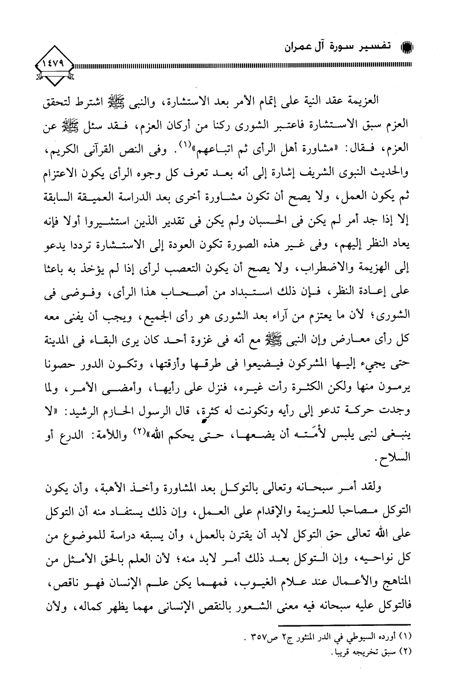 العزيمة عقد النية على إتمام الأمر بعد الاستشارة، والنبي - صلى الله عليه وسلم - اشترط لتحقق العزم سبق الاستشارة فاعتبر الشورى ركنا من أركان العزم، فقد سئل - صلى الله عليه وسلم - عن العزم، فقال: " مشاورة أهل الرأي ثم اتباعهم " (¬1). وفي النص القرآني الكريم، والحديث النبوي الشريف إشارة إلى أنه بعد تعرف كل وجوه الرأي يكون الاعتزام ثم يكون العمل، ولا يصح أن تكون مشاورة أخرى بعد الدراسة العميقة السابقة إلا إذا جد أمر لم يكن في الحسبان ولم يكن في تقدير الذين استشيروا أولا فإنه يعاد النظر إليهم، وفي غير هذه الصورة تكون العودة إلى الاستشارة ترددا يدعو إلى الهزيمة والاضطراب، ولا يصح أن يكون التعصب لرأي إذا لم يؤخذ به باعثا على إعادة النظر، فإن ذلك استبداد من أصحاب هذا الرأي، وفوضى في الشورى؛ لأن ما يعتزم من آراء بعد الشورى هو رأى الجميع، ويجب أن يفنى معه كل رأى معارض وإن النبي - صلى الله عليه وسلم - مع أنه في غزوة أحد كان يرى البقاء في المدينة حتى يجيء إليها المشركون فيضيعوا في طرقها وأزقتها، وتكون الدور حصونا يرمون منها ولكن الكثرة رأت غيره، فنزل على رأيها، وأمضى الأمر، ولما وجدت حركة تدعو إلى رأيه وتكونت له كثرة، قال الرسول الحازم الرشيد: " لا ينبغي لنبي يلبس لأْمَته أن يضعها، حتى يحكم الله " (¬2) واللأمة: الدرع أو السلاح.