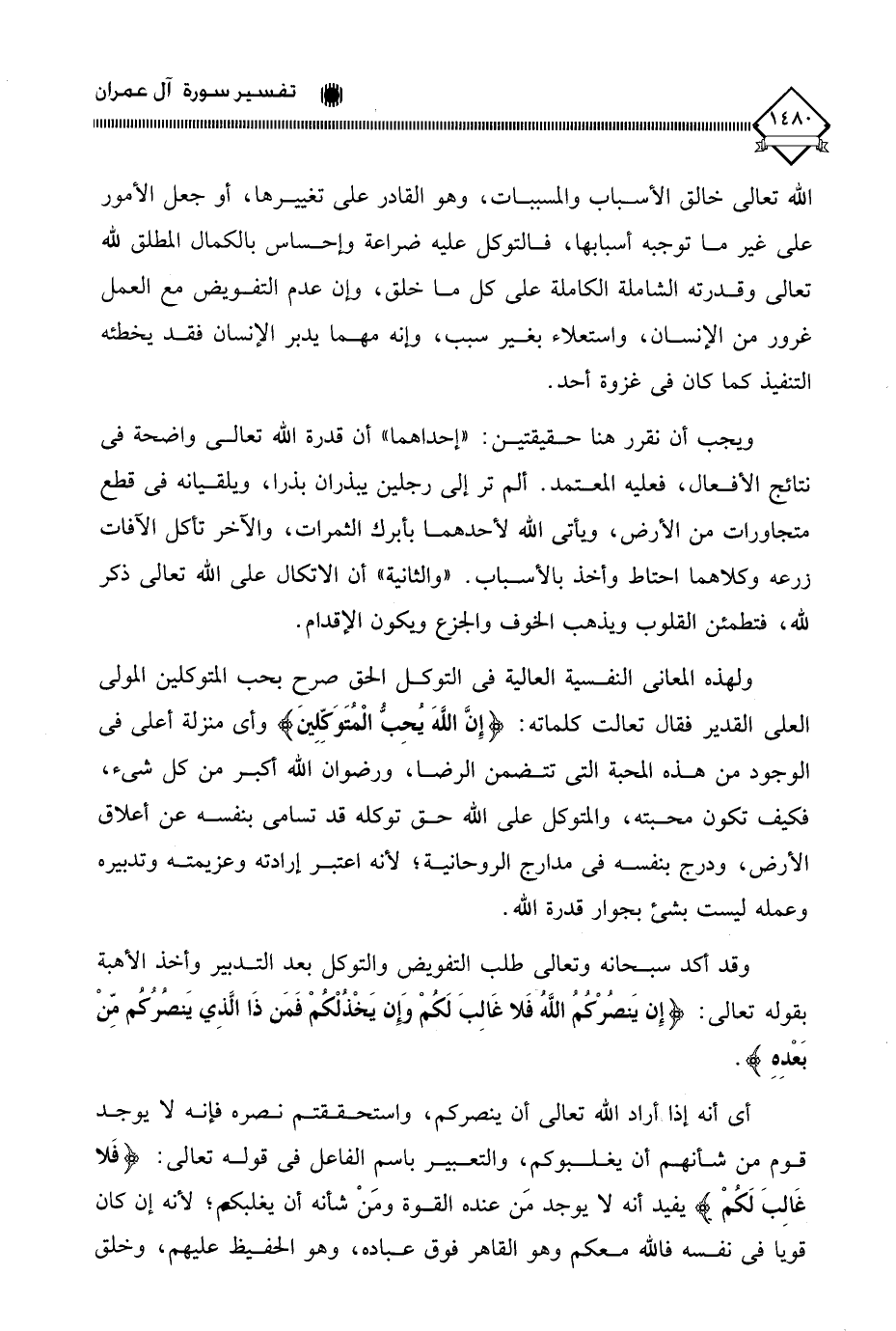 الله تعالى خالق الأسباب والمسببات، وهو القادر على تغييرها، أو جعل الأمور على غير ما توجبه أسبابها، فالتوكل عليه ضراعة وإحساس بالكمال المطلق لله تعالى وقدرته الشاملة الكاملة على كل ما خلق، وإن عدم التفويض مع العمل غرور من الإنسان، واستعلاء بغير سبب، وإنه مهما يدبر الإنسان فقد يخطئه التنفيذ كما كان في غزوة أحد.