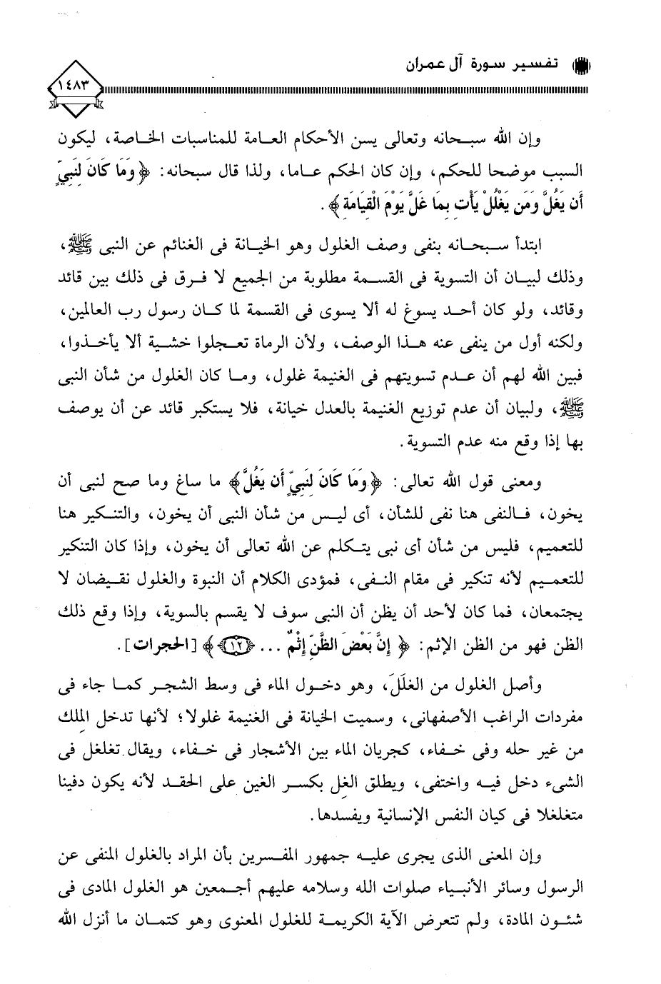 ومعنى قول الله تعالى: (وَمَا كَانَ لِنَبِيٍّ أَن يَغُلَّ) ما ساغ وما صح لنبي أن يخون، فالنفي هنا نفي للشأن، أي ليس من شأن النبي أن يخون، والتنكير هنا للتعميم، فليس من شأن أي نبي يتكلم عن الله تعالى أن يخون، وإذا كان التنكير للتعميم لأنه تنكير في مقام النفي، فمؤدى الكلام أن النبوة والغلول نقيضان لا يجتمعان، فما كان لأحد أن يظن أن النبي سوف لَا يقسم بالسوية، وإذا وقع ذلك الظن فهو من الظن الإثم: (إِنَّ بَعْضَ الظَّنِّ إِثْمٌ. . .).