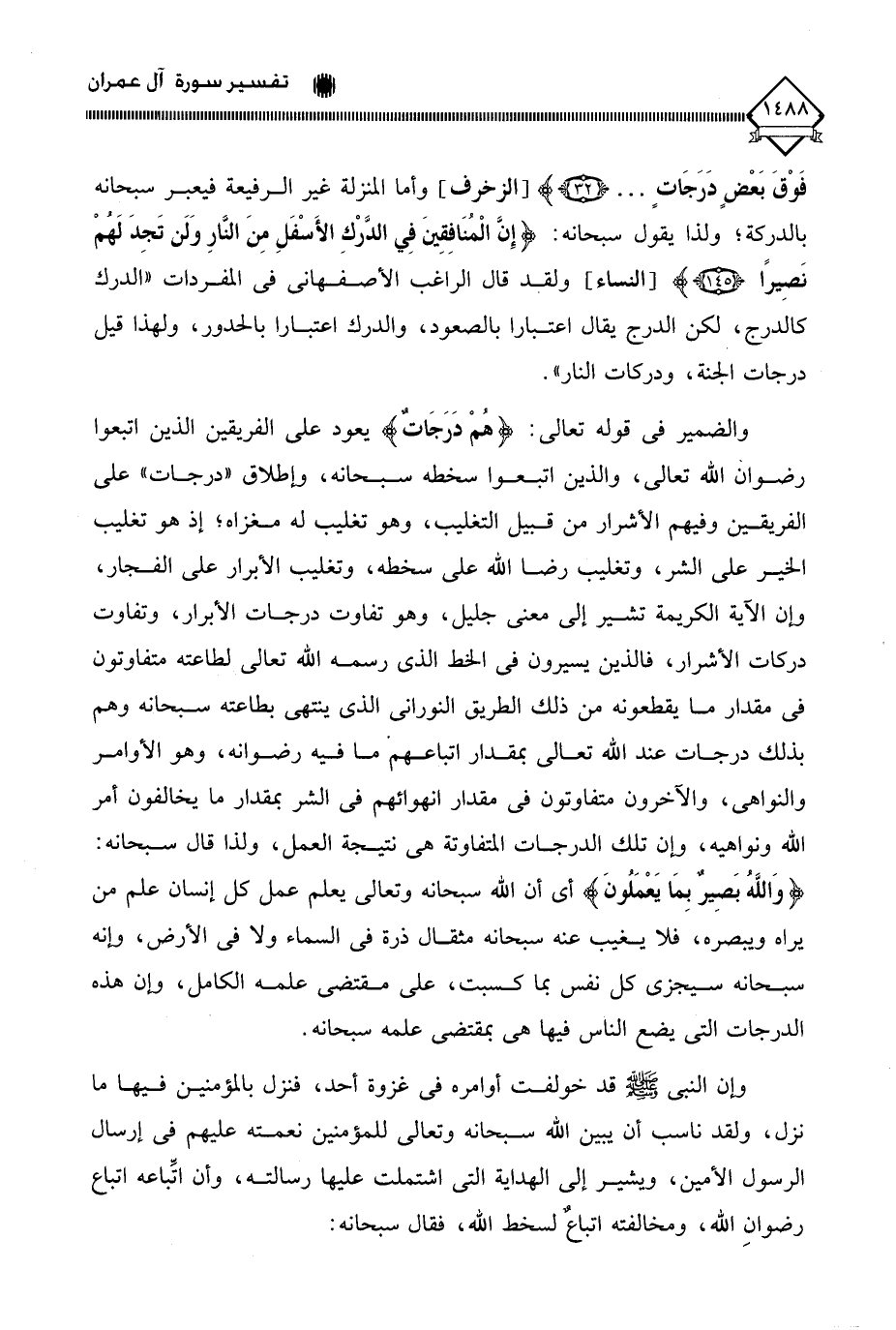 والضمير في قوله تعالى: (هُمْ دَرَجَاتٌ) يعود على الفريقين الذين اتبعوا رضوان الله تعالى، والذين اتبعوا سخطه سبحانه، وإطلاق " درجات " على الفريقين وفيهم الأشرار من قبيل التغليب، وهو تغليب له مغزاه؛ إذ هو تغليب الخير على الشر، وتغليب رضا الله على سخطه، وتغليب الأبرار على الفجار، وإن الآية الكريمة تشير إلى معنى جليل، وهو تفاوت درجات الأبرار، وتفاوت دركات الأشرار، فالذين يسيرون في الخط الذي رسمه الله تعالى لطاعته متفاوتون في مقدار ما يقطعونه من ذلك الطريق النوراني الذي ينتهي بطاعته سبحانه وهم بذلك درجات عند الله تعالى بمقدار اتباعهمْ ما فيه رضوانه، وهو الأوامر والنواهي، والآخرون متفاوتون في مقدار انهوائهم في الشر بمقدار ما يخالفون أمر الله ونواهيه، وإن تلك الدرجات المتفاوتة هي نتيجة العمل، ولذا قال سبحانه: (وَاللَّهُ بَصِيرٌ بِمَا يَعْمَلُونَ) أي أن الله سبحانه وتعالى يعلم عمل كل إنسان علم من يراه ويبصره، فلا يغيب عنه سبحانه مثقال ذرة في السماء ولا في الأرض، وإنه سبحانه سيجزي كل نفس بما كسبت، على مقتضى علمه الكامل، وإن هذه الدرجات التي يضع الناس فيها هي بمقتضى علمه سبحانه.
