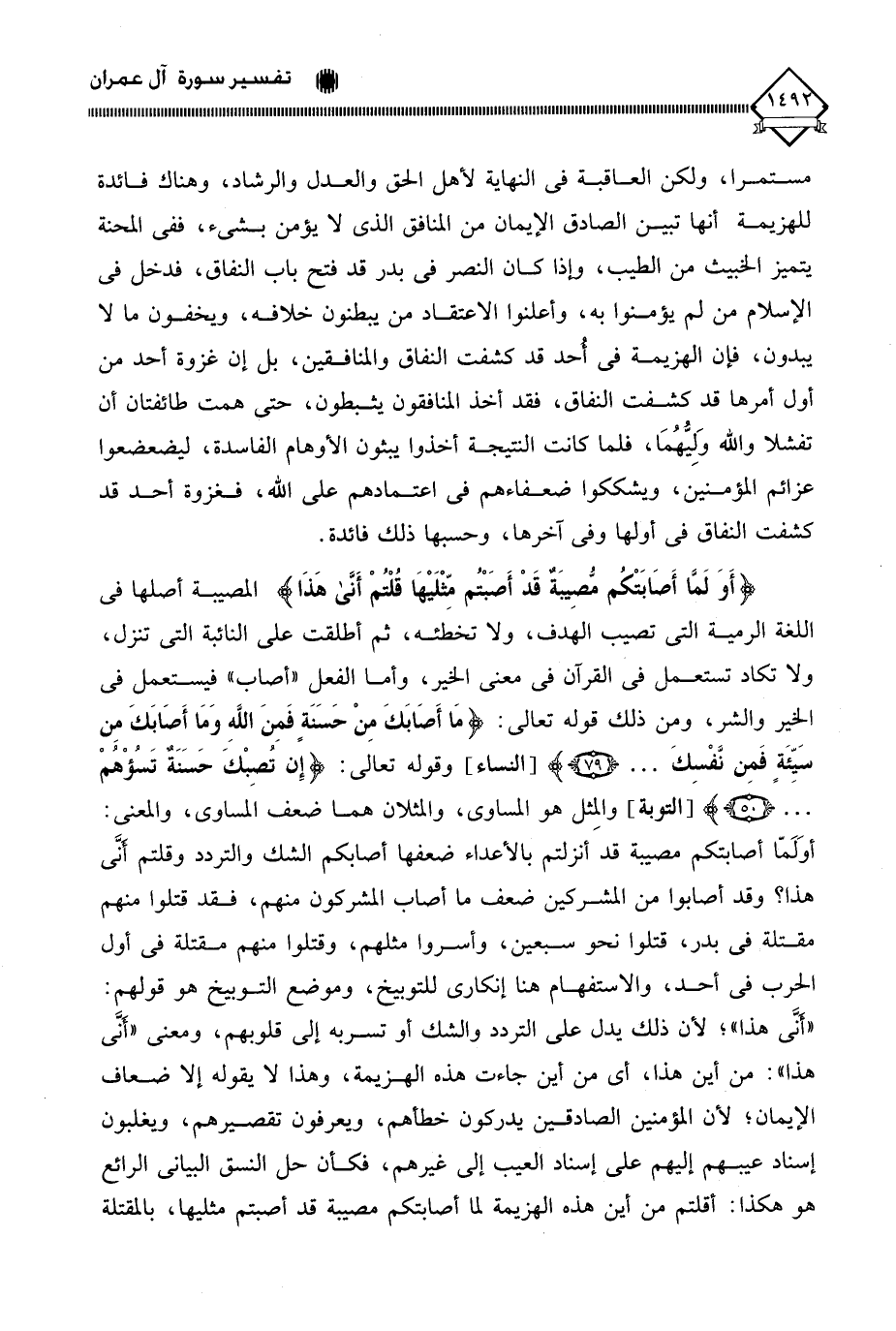 (أَوَلَمَّا أَصَابَتْكُم مُّصيبَةٌ قَدْ أَصَبْتُم مِّثْلَيْهَا قُلْتُمْ أَنَّى هَذَا) المصيبة أصلها في اللغة الرمية التي تصيب الهدف، ولا تخطئه، ثم أطلقت على النائبة التي تنزل، ولا تكاد تستعمل في القرآن في معنى الخير، وأما الفعل " أصاب " فيستعمل في الخير والشر، ومن ذلك قوله تعالى: (مَا أَصَابَكَ مِنْ حَسَنَةٍ فَمِنَ اللَّهِ وَمَا أَصَابَكَ مِن سَيِّئَةٍ فَمِن نَّفْسِكَ. . .)، وقوله تعالى: (إِن تُصِبْكَ حَسَنَةٌ تَسُؤْهُمْ. . .)، والمِثل هو المساوي، والمثلان هما ضعف المساوي، والمعنى: أوَلَمّا أصابتكم مصيبة قد أنزلتم بالأعداء ضعفها أصابكم الشك والتردد وقلتم انَى هذا؛ وقد أصابوا من المشركين ضعف ما أصاب المشركون منهم، فقد قتلوا منهم مقتلة في بدر، قتلوا نحو سبعين، وأسروا مثلهم، وقتلوا منهم مقتلة في أول الحرب في أحد، والاستفهام هنا إنكاري للتوبيخ، وموضع التوبيخ هو قولهم: " أنَّى هذا "، لأن ذلك يدل على التردد والشك أو تسربه إلى قلوبهم، ومعنى " أنَّى هذا ": من أين هذا؟ أي من أين جاءت هذه الهزيمة، وهذا لَا يقوله إلا ضعاف الإيمان، لأن المؤمنين الصادقين يدركون خطاهم، ويعرفون تقصيرهم، ويغلبون إسناد عيبهم إليهم على إسناد العيب إلى غيرهم، فكأن حل النسق البياني الرائع هو هكذا: أقلتم من أين هذه الهزيمة لما أصابتكم مصيبة قد أصبتم مثليها، بالمقتلة