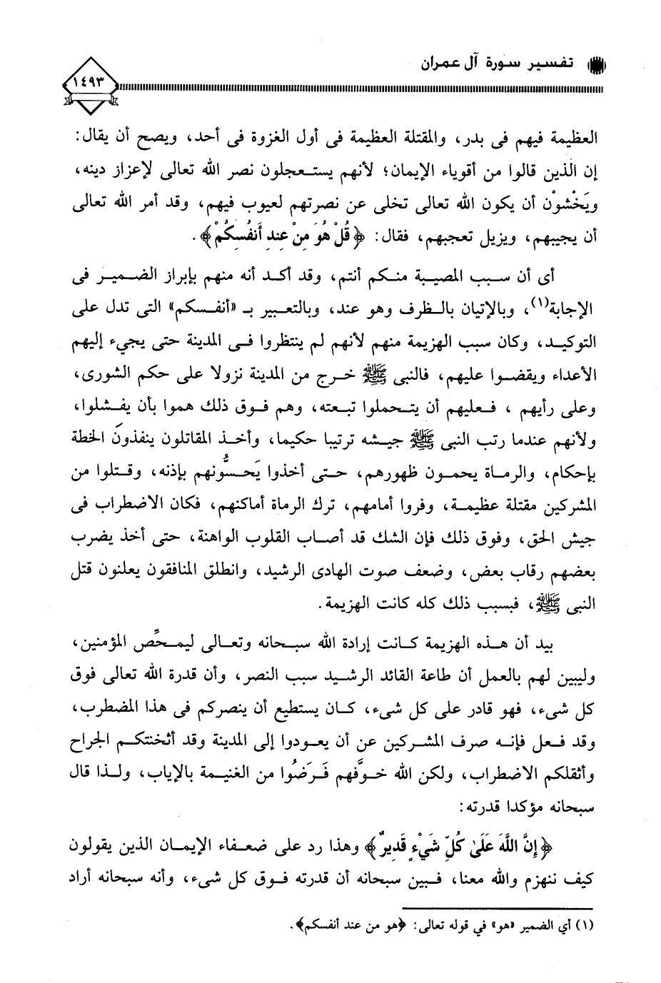 بيد أن هذه الهزيمة كانت إرادة الله سبحانه وتعالى ليمحِّص المؤمنين، وليبين لهم بالعمل أن طاعة القائد الرشيد سبب النصر، وأن قدرة الله تعالى فوق كل شيء، فهو قادر على كل شيء، كان يستطيع أن ينصركم في هذا المضطرب، وقد فعل فإنه صرف المشركين عن أن يعودوا إلى المدينة وقد أثخنتكم الجراح وأثقلكم الاضطراب، ولكن الله خوَّفهم فَرَضُوا من الغنيمة بالإياب، ولذا قال سبحانه مؤكدا قدرته:
