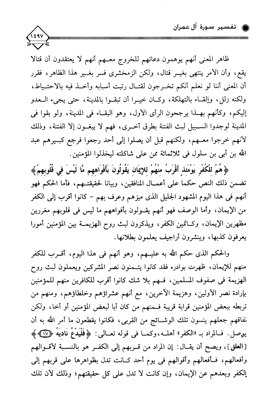 (هُمْ لِلْكُفْرِ يَوْمَئِذ أَقْرَبُ مِنْهُمْ لِلإِيمَانِ يَقُولُونَ بَأفْوَاهِهِم مَا لَيْسَ فِي قُلُوبِهِمْ) تضمن ذلك النص حكما على أعمال المنافقين، وبيانا لحقيقتهم، فأما الحكم فهو أنهم في هذا اليوم المشهود الجليل الذي ميزهم وعرف بهم - كانوا أقرب إلى الكفر من الإيمان، وأما الوصف فهو أنهم يقولون بأفواههم ما ليس في قلوبهم مغررين مظهرين الإيمان، وكاتمين الكفر، ويذكرون لبث روح الهزيمة بين المؤمنين أمورا يعرفون كذبها، وينشرون أراجيف يعلمون بطلانها.