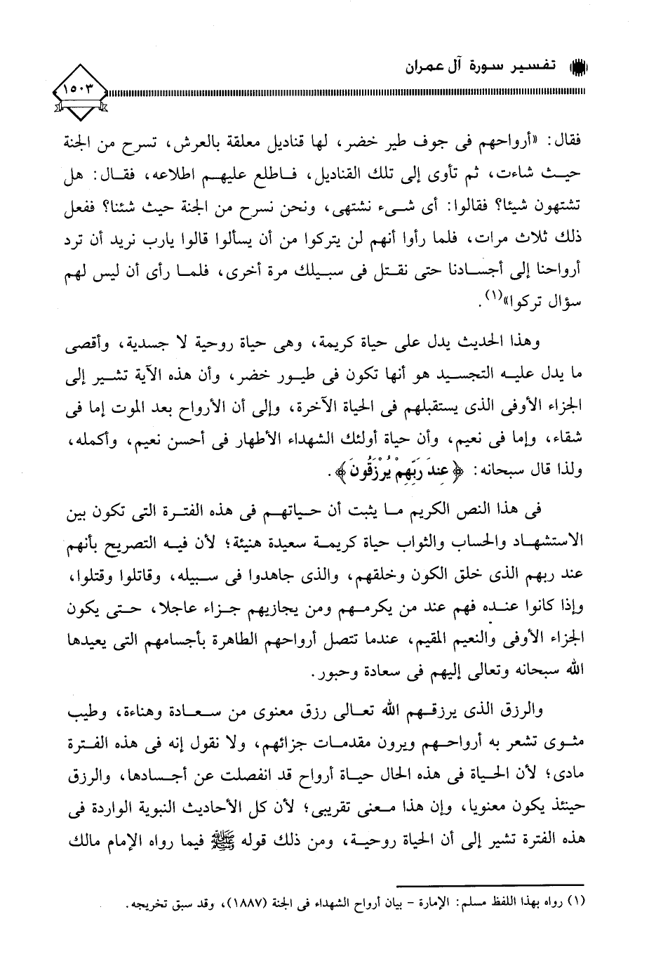 وهذا الحديث يدل على حياة كريمة، وهي حياة روحية لَا جسدية، وأقصى ما يدل عليه التجسيد هو أنها تكون في طيور خضر، وأن هذه الآية تشير إلى الجزاء الأوفى الذي يستقبلهم في الحياة الآخرة، وإلى أن الأرواح بعد الموت إما في شقاء، وإما في نعيم، وأن حياة أولئك الشهداء الأطهار في أحسن نعيم، وأكمله، ولذا قال سبحانه: (عِندَ رَبِّهِمْ يُرْزَقُونَ).