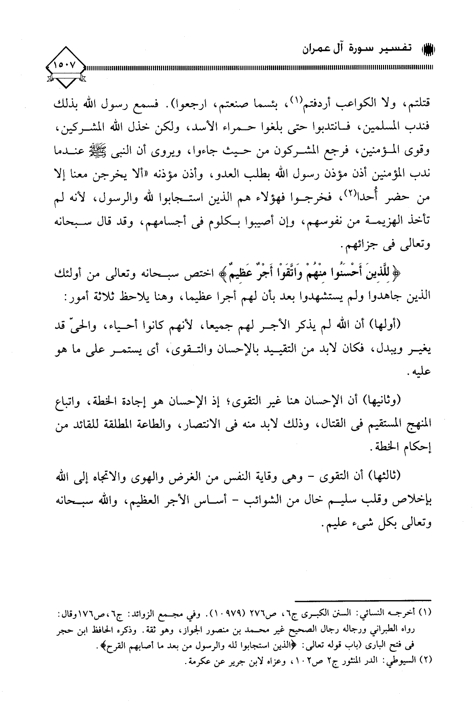 (وثانيها) أن الإحسان هنا غير التقوى، إذ الإحسان هو إجادة الخطة، واتباع المنهج المستقيم في القتال، وذلك لابد منه في الانتصار، والطاعة المطلقة للقائد من إحكام الخطة.