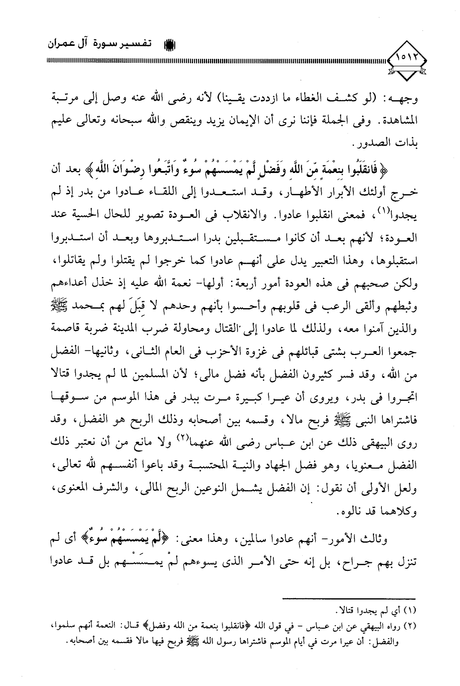 (¬2) رواه البيهقي عن ابن عباس - في قول الله (فانقلبوا بنعمة من الله وفضل) قال: النعمة أنهم سلموا، والفضل: أن عيرا مرت في أيام الموسم فاشتراها رسول الله - صلى الله عليه وسلم - فربح فيها مالا فقسمه بين أصحابه.