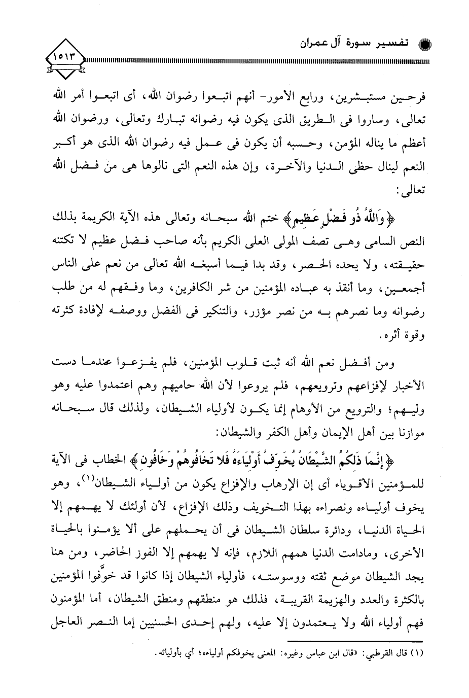 الخطاب في الآية للمؤمنين الأقوياء أي إن الإرهاب والإفزاع يكون من أولياء الشيطان (¬1)، وهو يخوف أولياءه ونصراءه بهذا التخويف وذلك الإفزاع، لأن أولئك لَا يهمهم إلا الحياة الدنيا، ودائرة سلطان الشيطان في أن يحملهم على ألا يؤمنوا بالحياة الأخرى، وما دامت الدنيا همهم اللازم، فإنه لَا يهمهم إلا الفوز الحاضر، ومن هنا يجد الشيطان موضع ثقته ووسوسته، فأولياء الشيطان إذا كانوا قد خوَّفوا المؤمنين بالكثرة والعدد والهزيمة القريبة، فذلك هو منطقهم ومنطق الشيطان، أما المؤمنون فهم أولياء الله ولا يعتمدون إلا عليه، ولهم إحدى الحسنيين إما النصر العاجل