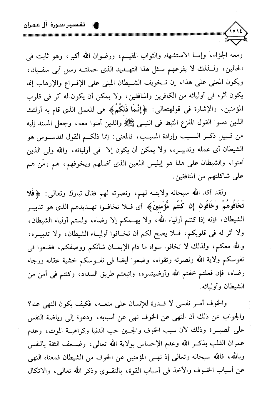 ومعه الجزاء، وإما الاستشهاد والثواب المقيم، ورضوان الله أكبر، وهو ثابت في الحالين، ولذلك لَا يفزعهم مثل هذا التهديد الذي حملته رسل أبي سفيان، ويكون المعنى على هذا، إن تخويف الشيطان المبني على الإفزاع والإرهاب إنما يكون أثره في أوليائه من الكافرين والمنافقين، ولا يمكن أن يكون له أثر في قلوب المؤمنين، والإشارة في قوله تعالى: (إِنَّمَا ذَلِكمُ) هي للعمل الذي قام به أولئك الذين دسوا القول المفزع المثبط في النبي - صلى الله عليه وسلم - والذين آمنوا معه، وجعل المسند إليه من قبيل ذكر السبب وإرادة المسبب، فالمعنى: إنما ذلكم القول المدسوس هو الشيطان أي عمله وتدبيره، ولا يمكن أن يكون إلا في أوليائه، والله ولي الذين آمنوا، والشيطان على هذا هو إبليس اللعين الذي أضلهم ويخوفهم، هم ومَن هم على شاكلتهم من المنافقين.