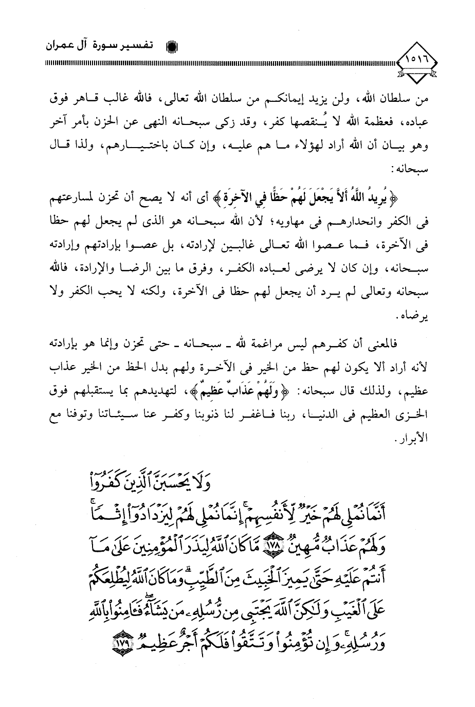 (إِنَّ الَّذِينَ اشْتَرَوُا الْكُفْرَ بِالْإِيمَانِ لَنْ يَضُرُّوا اللَّهَ شَيْئًا وَلَهُمْ عَذَابٌ أَلِيمٌ (177) وَلَا يَحْسَبَنَّ الَّذِينَ كَفَرُوا أَنَّمَا نُمْلِي لَهُمْ خَيْرٌ لِأَنْفُسِهِمْ إِنَّمَا نُمْلِي لَهُمْ لِيَزْدَادُوا إِثْمًا وَلَهُمْ عَذَابٌ مُهِينٌ (178) مَا كَانَ اللَّهُ لِيَذَرَ الْمُؤْمِنِينَ عَلَى مَا أَنْتُمْ عَلَيْهِ حَتَّى يَمِيزَ الْخَبِيثَ مِنَ الطَّيِّبِ وَمَا كَانَ اللَّهُ لِيُطْلِعَكُمْ عَلَى الْغَيْبِ وَلَكِنَّ اللَّهَ يَجْتَبِي مِنْ رُسُلِهِ مَنْ يَشَاءُ فَآمِنُوا بِاللَّهِ وَرُسُلِهِ وَإِنْ تُؤْمِنُوا وَتَتَّقُوا فَلَكُمْ أَجْرٌ عَظِيمٌ (179)
