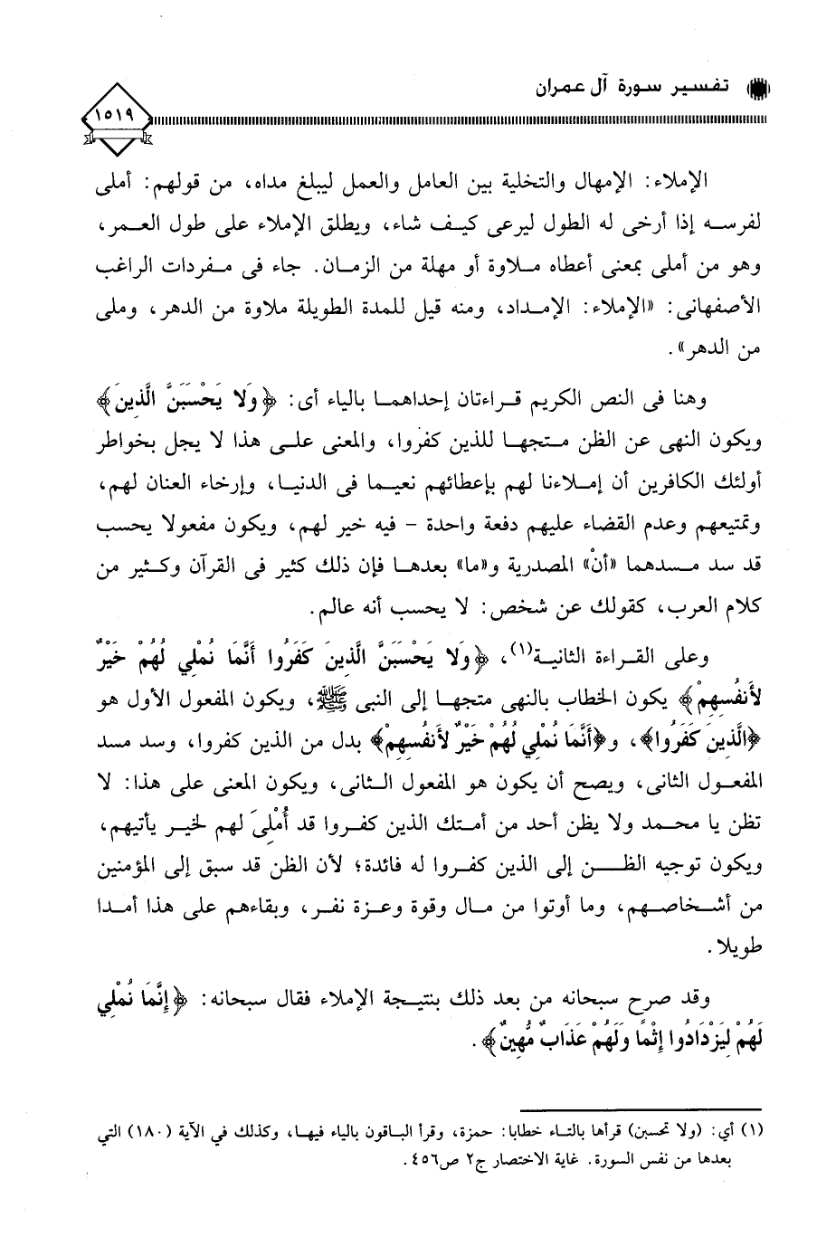 وعلى القراءة الثانية (¬1)، (وَلَا يَحْسَبَنَّ الَّذِينَ كَفَرُوا أَنَّمَا نُمْلِي لَهُمْ خَيْرٌ لِأَنْفُسِهِمْ) يكون الخطاب بالنهي متجها إلى النبي - صلى الله عليه وسلم -، ويكون المفعول الأول هو (الَّذِينَ كَفَرُوا)، و (أَنَّمَا نُمْلِي لُهُمْ خَيْرٌ لأَنفسِهِمْ) بدل من الذين كفروا، وسد مسد المفعول الثاني، ويصح أن يكون هو المفعول الثاني، ويكون المعنى على هذا: لا تظن يا محمد ولا يظن أحد من أمتك الذين كفروا قد أُمْلِي لهم لخير يأتي هم، ويكون توجيه الظن إلى الذين كفروا له فائدة؛ لأن الظن قد سبق إلى المؤمنين من أشخاصهم، وما أوتوا من مال وقوة وعزة نفر، وبقاءهم على هذا أمدا طويلا.