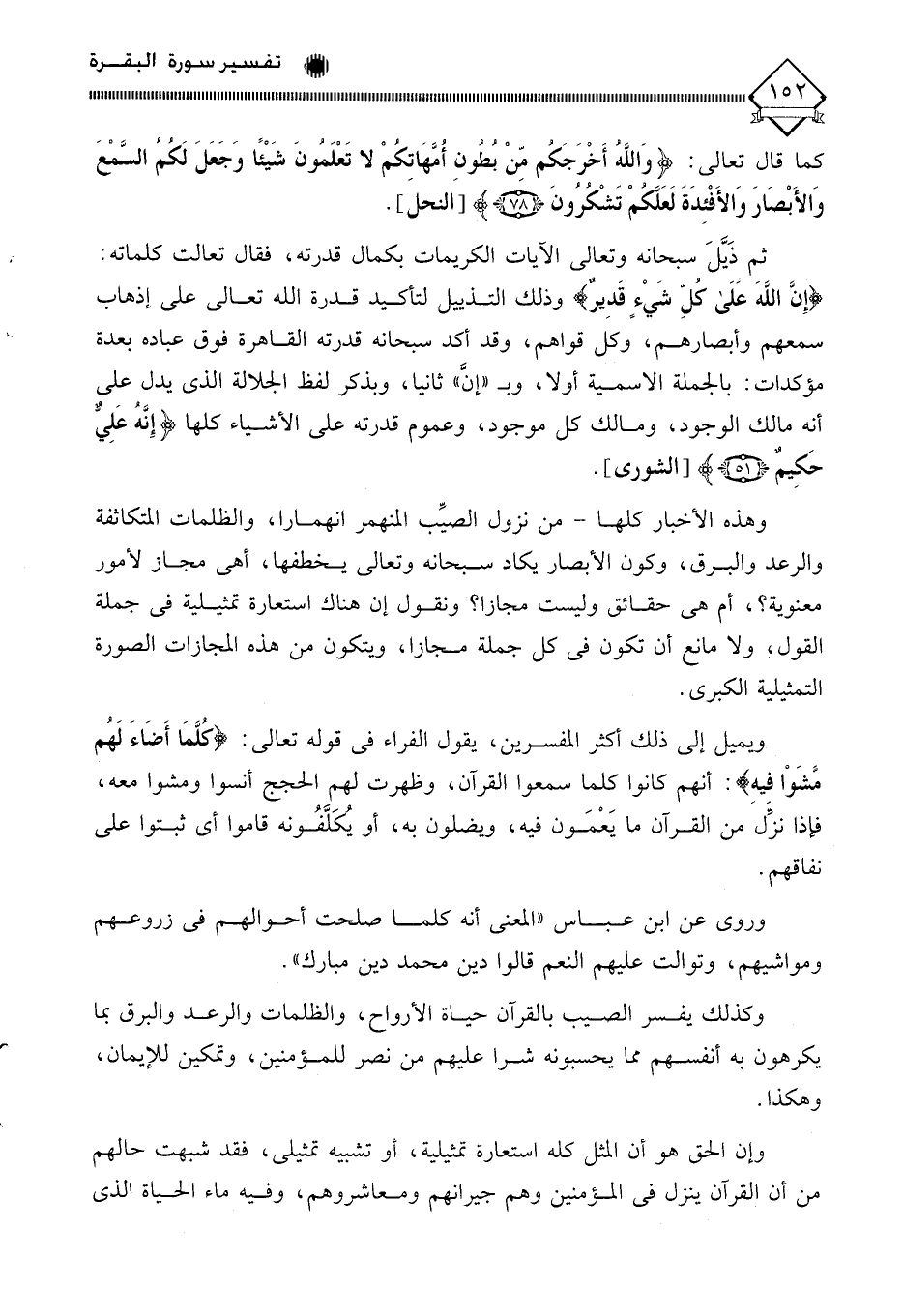 وهذه الأخبار كلها - من نزول الصيِّب المنهمر انهمارا، والظلمات المتكاثفة والرعد والبرق، وكون الأبصار يكاد سبحانه وتعالى يخطفها، أهي مجاز لأمور معنوية؟، أم هي حقائق وليست مجازا؛ ونقول إن هناك استعارة تمثيلية في جملة القول، ولا مانع أن تكون في كل جملة مجازا، ويتكون من هذه المجازات الصورة التمثيلية الكبرى.