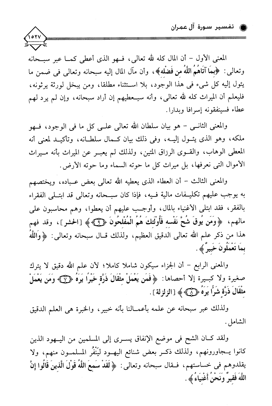 والمعنى الثالث - أن العطاء الذي يعطيه الله تعالى بعض عباده، ويختصهم به يوجب عليهم تكليفات مالية فيه، فإذا كان سبحانه وتعالى قد ابتلى الفقراء بالفقر، فقد ابتلى الأغنياء بالمال، وأوجب عليهم أن يعطوا، وهم محاسبون على مالهم، (وَمَن يُوقَ شُحَّ نَفْسِهِ فَأُوْلَئِكَ هُم الْمُفْلِحُونَ)، وقد فهم هذا من ذكر علم الله تعالى الدقيق العظيم، ولذلك قال سبحانه وتعالى: (وَاللَّه بِمَا تَعْمَلُونَ خَبِيرٌ).